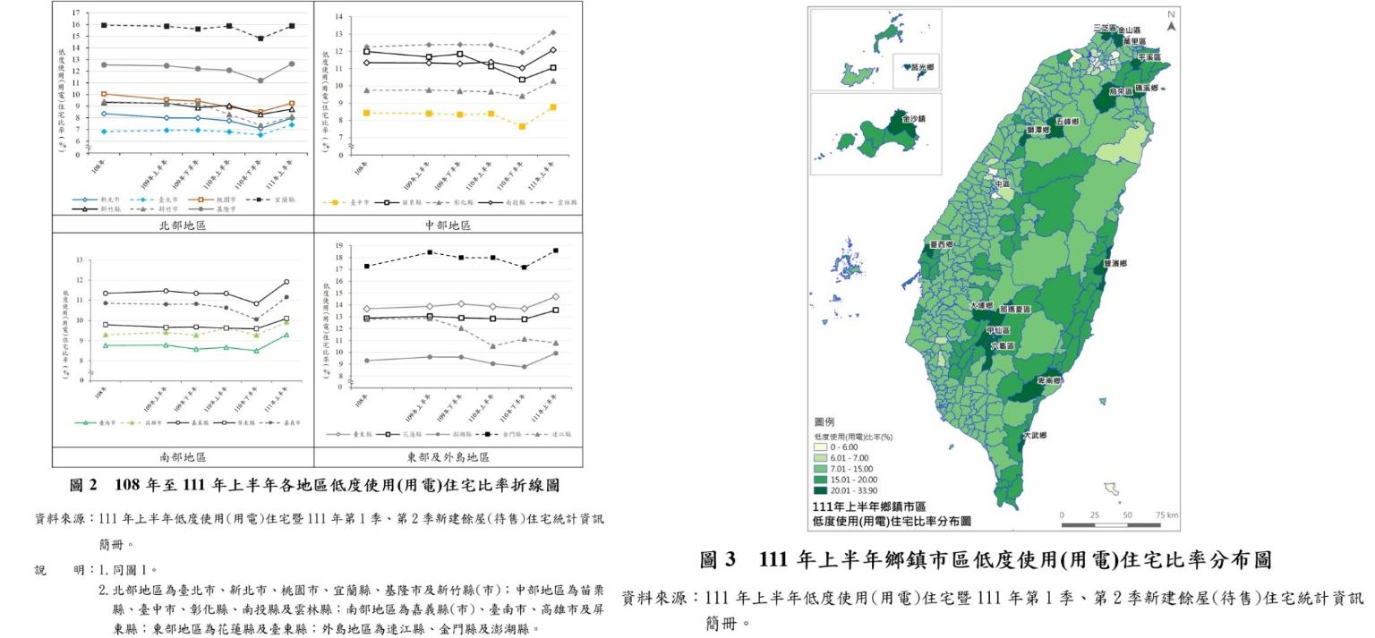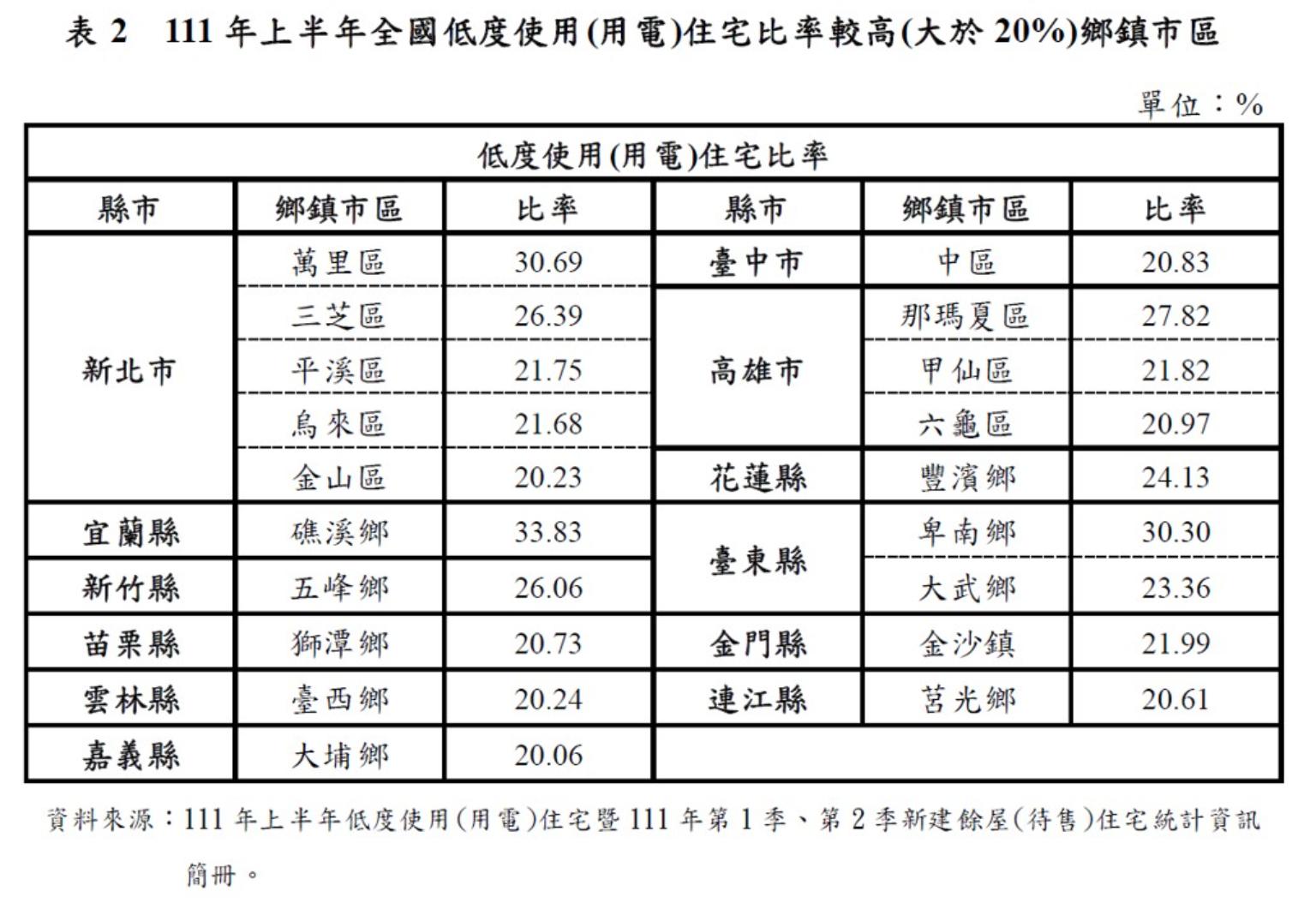 就鄉鎮市區別觀察,本期低度使用住宅比率大於20%的地區,由上期的16個增至本期的19個,增加了新北市烏來區與金山區、臺中市中區、雲林縣臺西鄉,減少了臺南市左鎮區,另苗栗縣獅潭鄉則取代造橋鄉。
