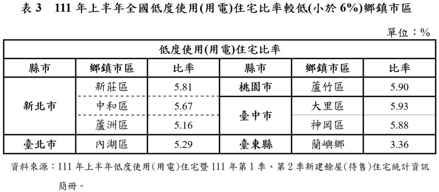 本期低度使用住宅比率小於6%的地區,由上期的21個減至8個;主要集中於新北市新莊區、中和區、蘆洲區,臺北市內湖區,桃園市蘆竹區,臺中市大里區、神岡區,臺東縣蘭嶼鄉等8個鄉鎮市區。