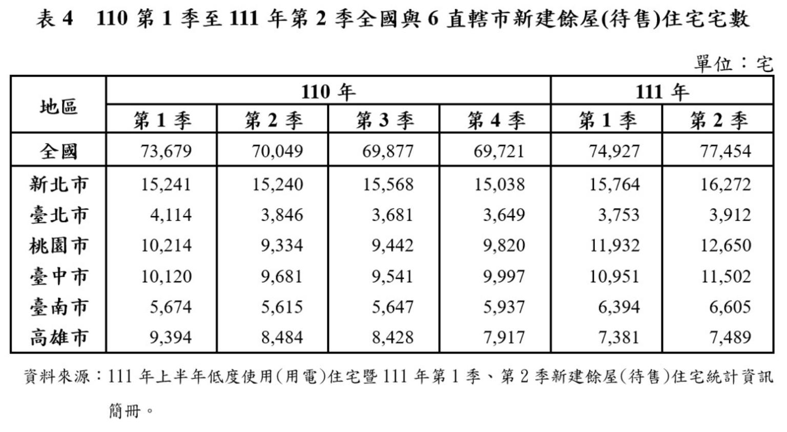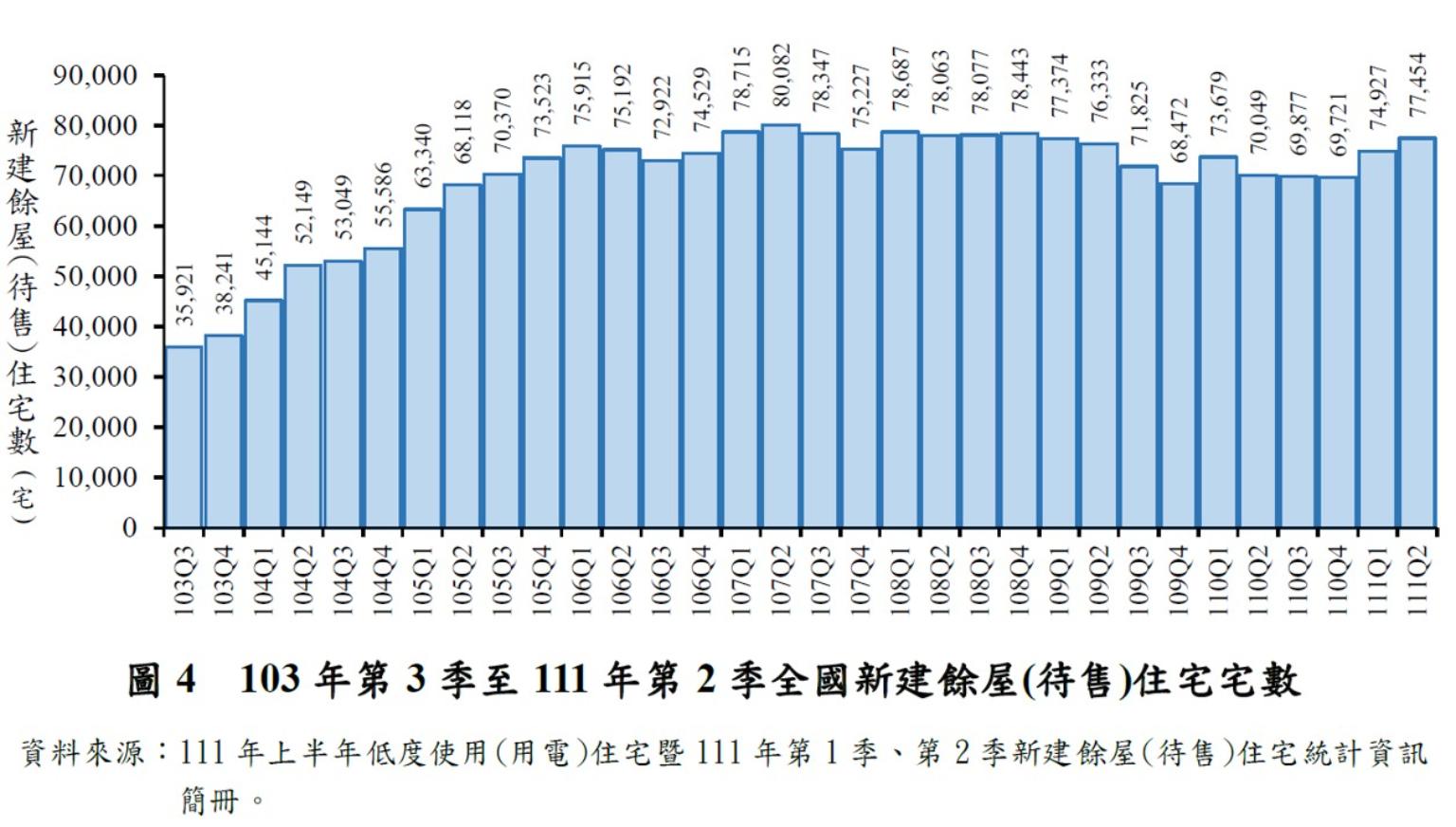 內政部表示,全國新建餘屋(待售)住宅於109年下半年至110年下半年數量呈現平穩,均維持在7萬宅左右, 111年上半年則呈增加趨勢,第1季為7萬4,927宅,第2季為7萬7,454宅,均較上季、去年同季增加。其中,111年第2季較上季增加2,527宅(+3.37%),較去年同季增加7,405宅(+10.57%),高於近5年平均數量7萬5,140宅。