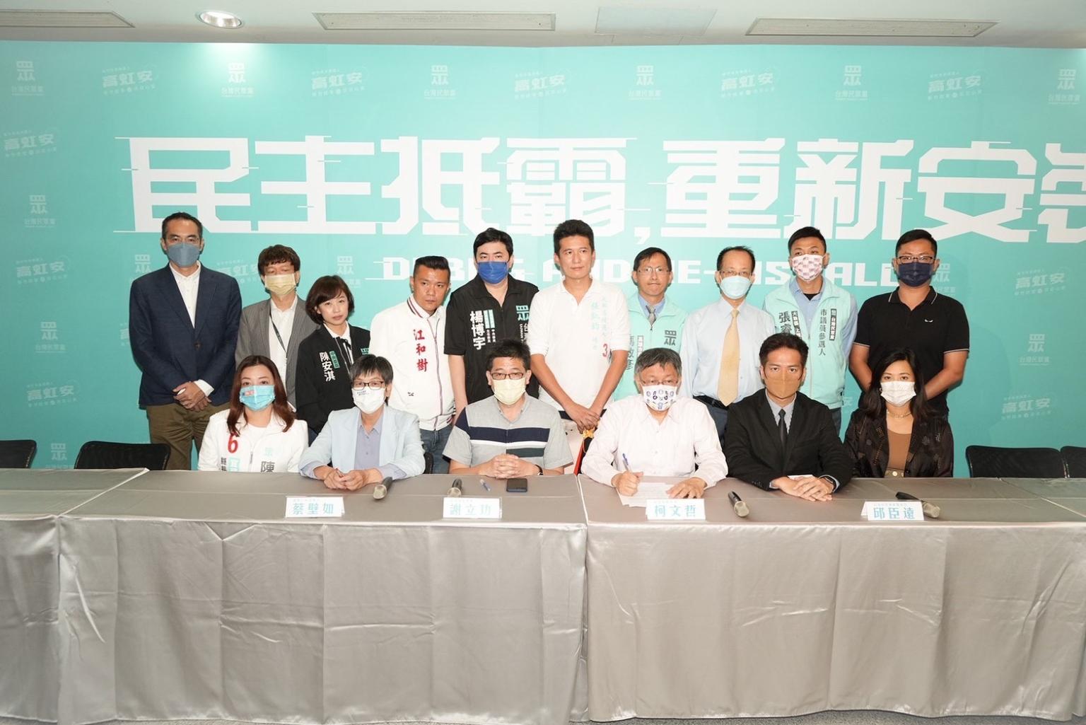 柯文哲今日率領秘書長謝立功、立法院黨總召邱臣遠、選戰小組召集人蔡壁如、立委吳欣盈與中央委員、中評委,召開「民主抵霸(Debug),重新安裝」記者會聲援高虹安。