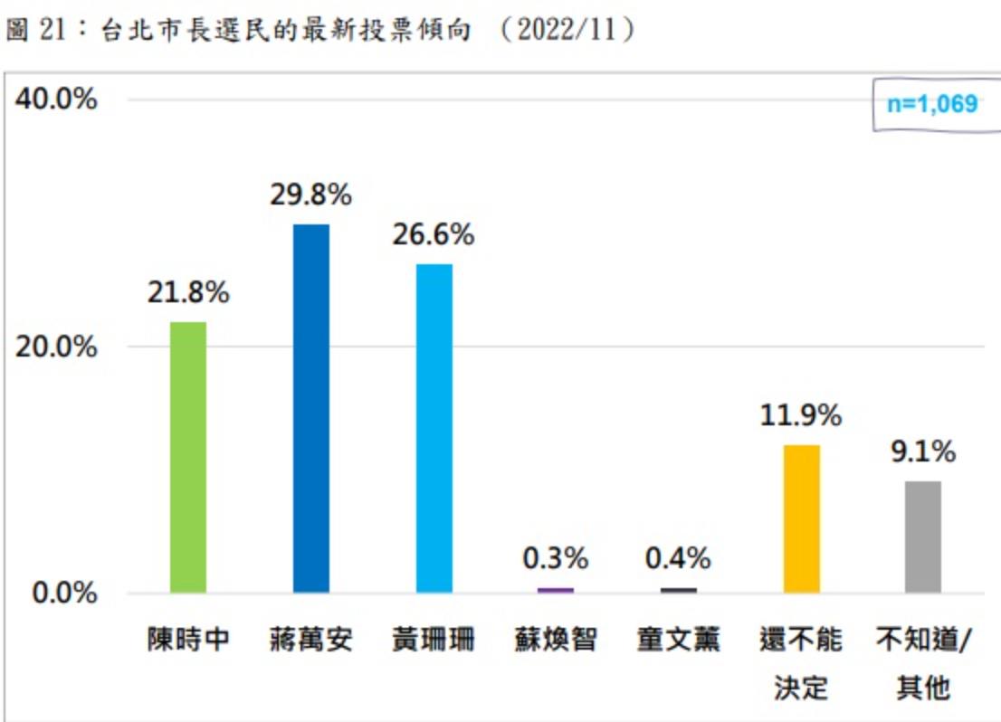 在三人溫度互有高底情形下,如果明天就投票,蔣萬安仍以29.8%一枝獨秀,領先第二名的黃珊珊 3.2%,陳時中落後黃珊珊4.8%。
