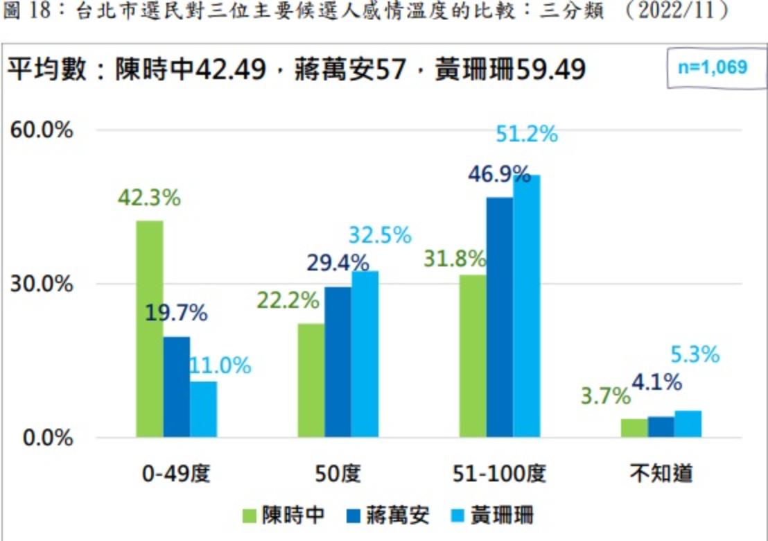 而黃珊珊的感情溫度,台北市選民五成一對黃珊珊有好感,三成三對她沒感覺,一成一成對她有反感,平均溫度59.49度,為三人之中最高。