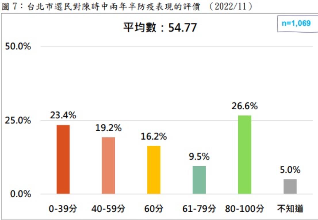 台灣民意基金會今日舉行「2022台北市長選舉的最新發展:兼談桃園最新選情」。有關陳時中的部分,對他兩年半防疫表現的評價,,三成六給61分以上成績,一成六打剛好 60 分,四成三打不及格;整體來看,雖然有五成二台北市選民給出60分及格以上成績,但總平均成績卻不及格,只有54.77分。