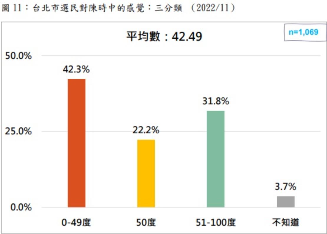 再看台北市選民對陳時中的感情溫度,有三成二好感,二成二對他沒感覺,四成二對他有反感,反感的比好感的多出10個百分點,平均溫度42.49度;報告中強調,當六成五台北市選民對陳時中不是無感就是反感時,無疑是一個嚴重的警訊。