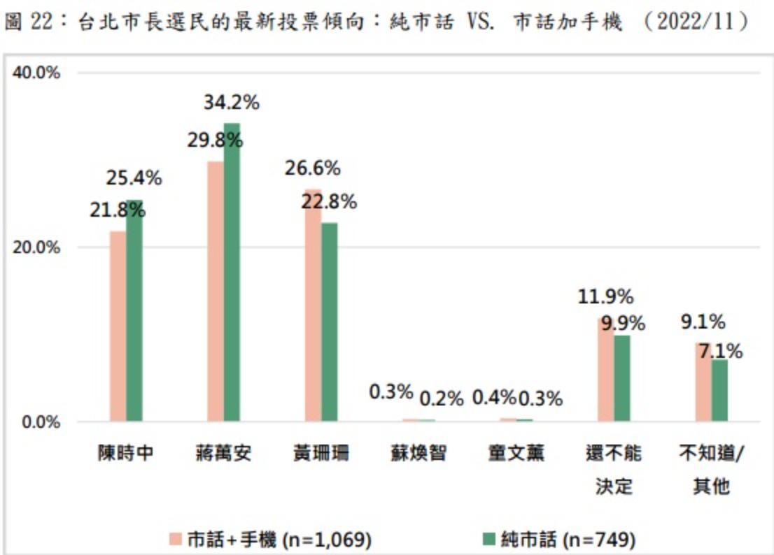 惟調查方式經改為「市話加手機」後,出現驚人的變化。蔣萬安降了4.4%,陳時中降了3.6%,只有年輕人支持度最高的黃珊珊,反向提升了3.8%。