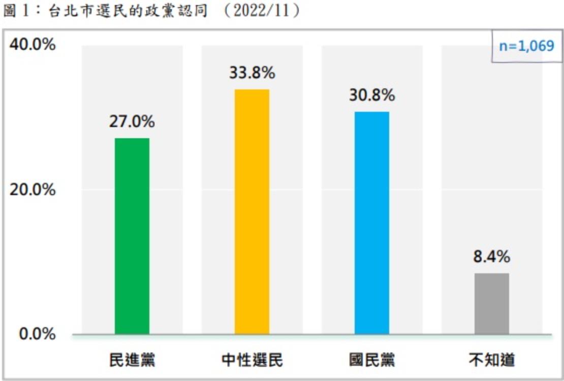 有關政黨基本盤部分,調查顯示,台北市選民中,有二成七綠營認同者,其中深綠 9.2%,淺綠一成八;同時,有三成一藍營認同者,5.6%深藍,二成五淺藍;此外,有三成四中性選民,藍稍佔上風。