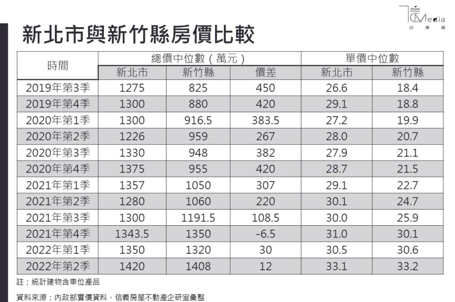 若以單價差距來看,同樣含車位的建物中位單價,2019年第三季新北每坪26.6萬元,新竹縣則是每坪18.4萬元,新北市每坪單價比新竹縣多約8萬元,不過今年第二季新北市房價每坪33.1萬元,新竹縣則是每坪33.2萬元,已經追上新北市。