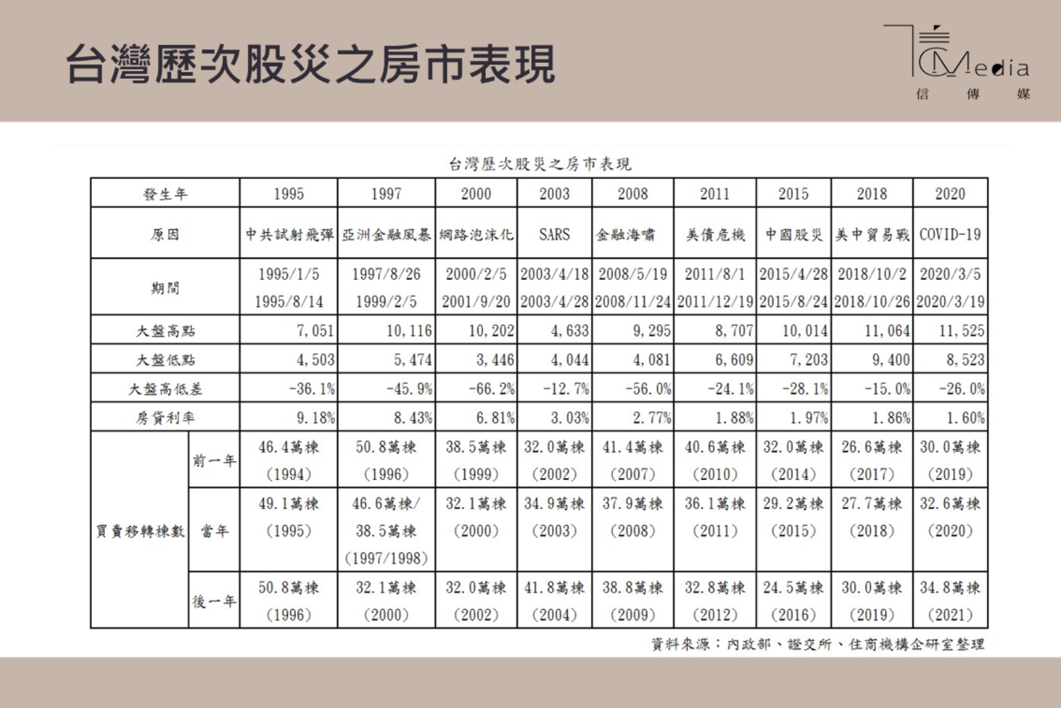 然而,若如1997年亞洲金融風暴與2000年網路泡沫,造成長時間的經濟傷害,股票市值大量蒸發,投資人受創慘烈,加上當時平均房貸利率超過6%,房市表現便難以期待。至於2015年中國股災隔年(2016)買賣移轉棟數僅24.5萬棟,創下歷史低點,則是因房地合一所得稅初上路,重挫房市信心,交易量急速緊縮,不過隔年因諸多區域房價盤整吸引買方回籠,當時並無打房新政,加上資金動能強勁,不動產市場立即谷底回升。