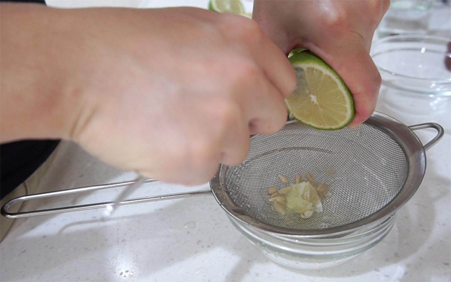 首先將檸檬切半榨汁。可以拿一個濾網墊在碗上面,這樣可以防止檸檬籽掉入。