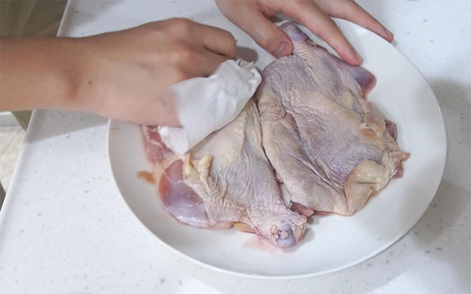 雞腿排下鍋前先將表面水分擦乾,避免油噴。