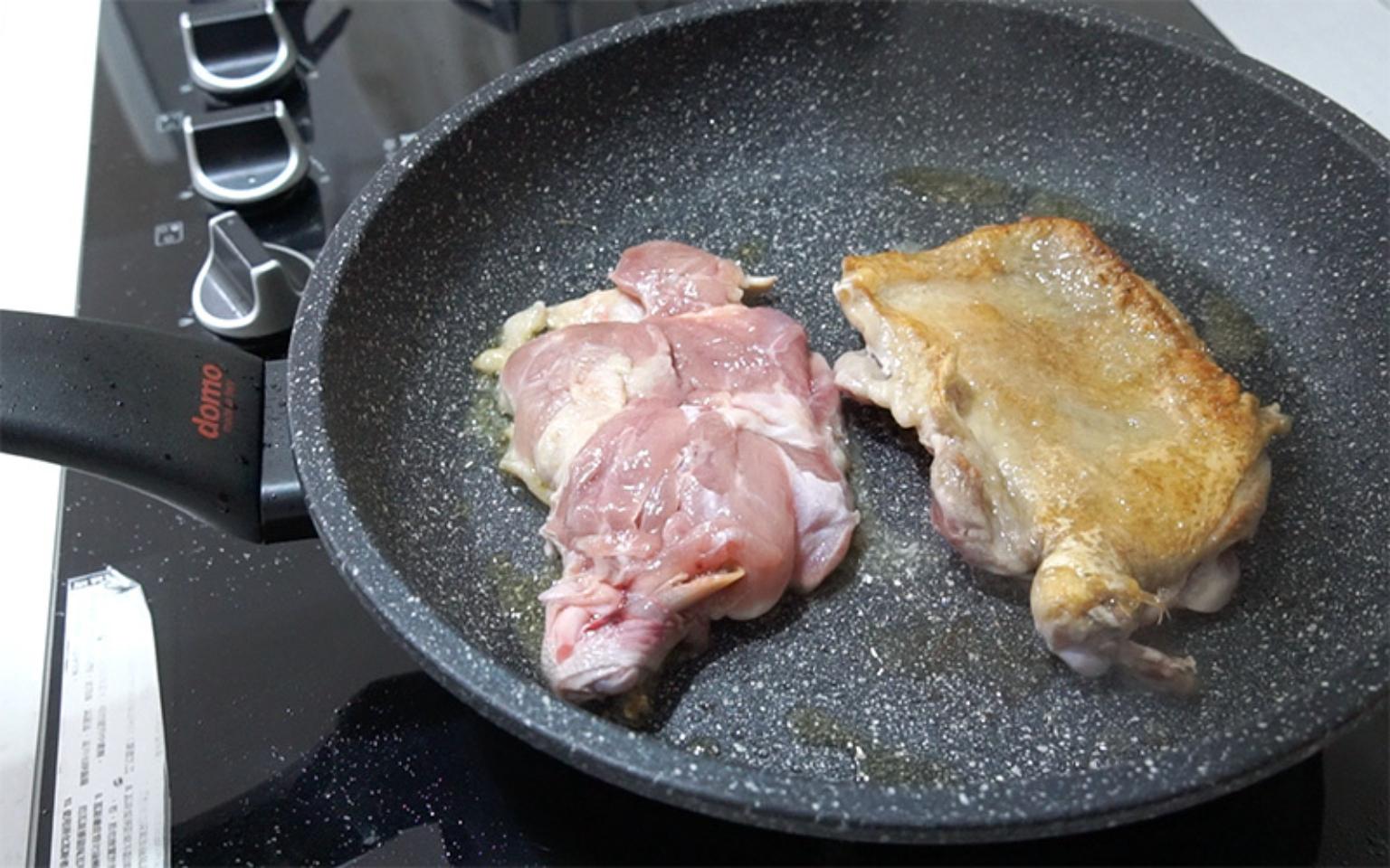 平底鍋熱鍋後,放入雞腿排。一開始要先雞皮面朝下。兩面煎到金黃上色。
