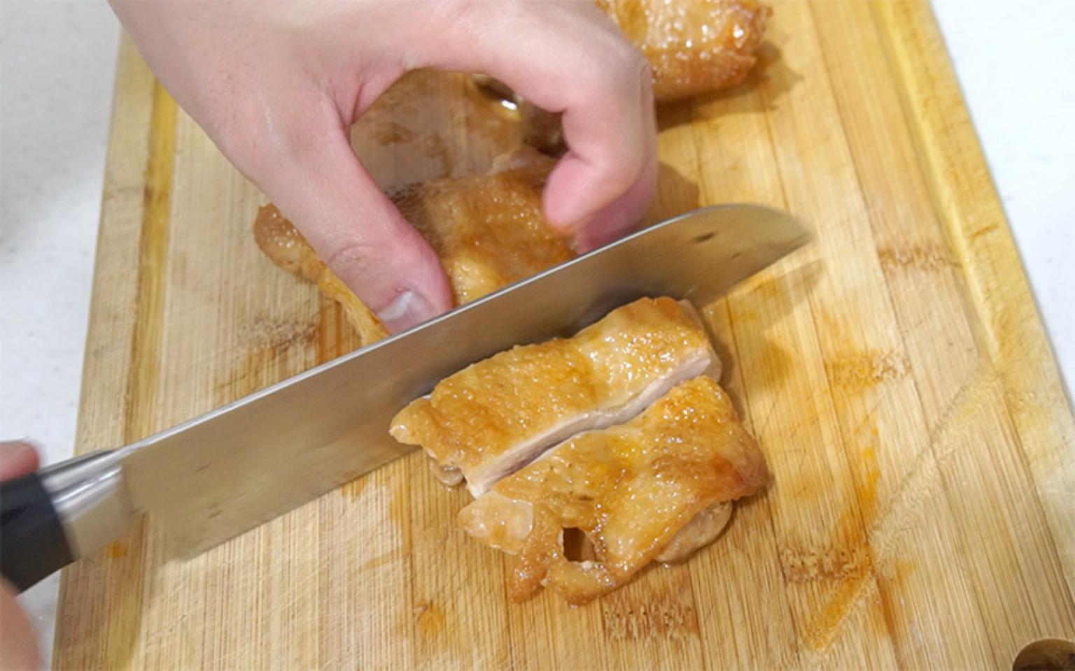 將雞腿排切塊即可擺盤。