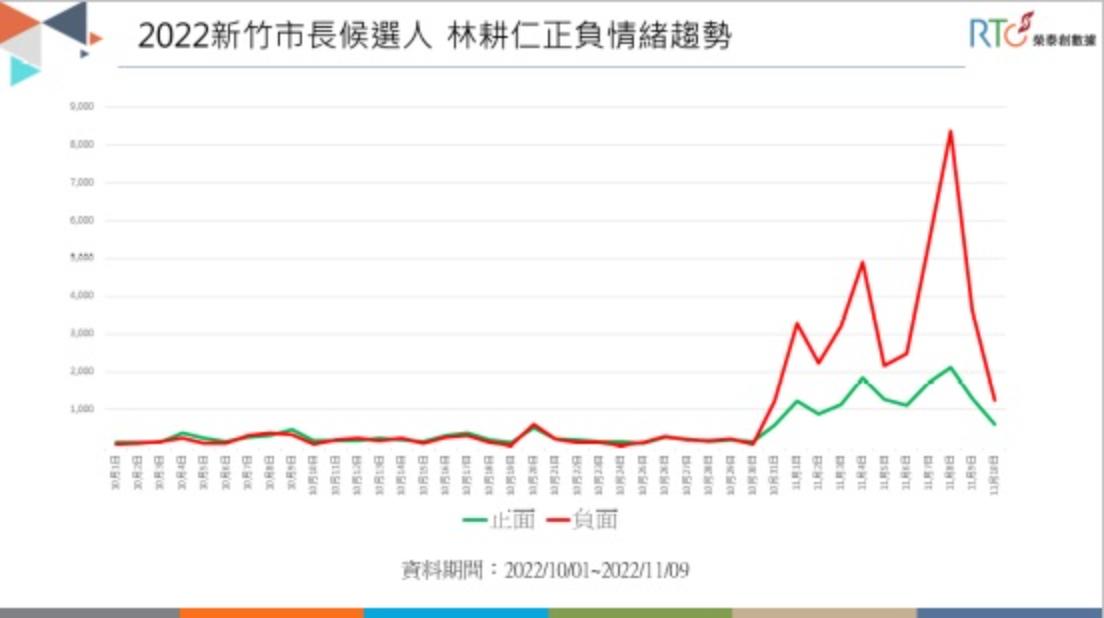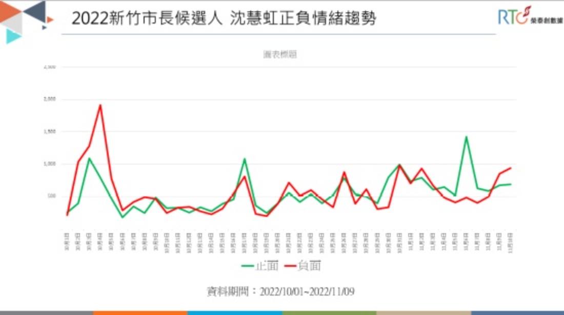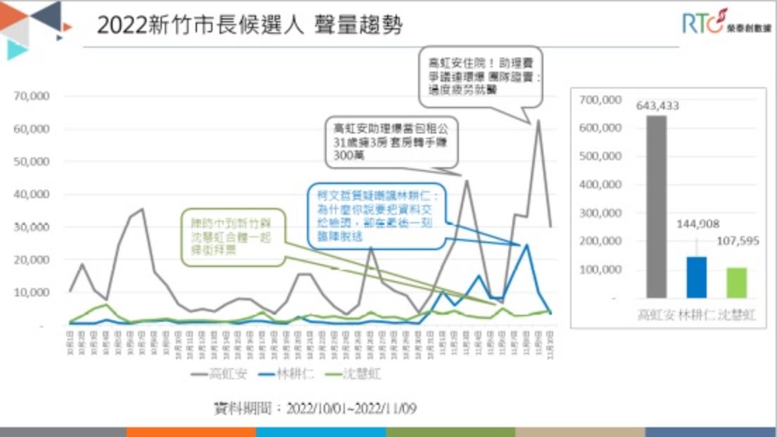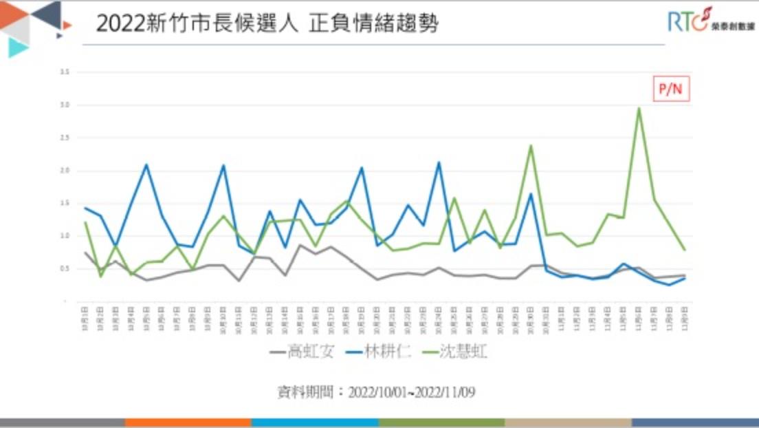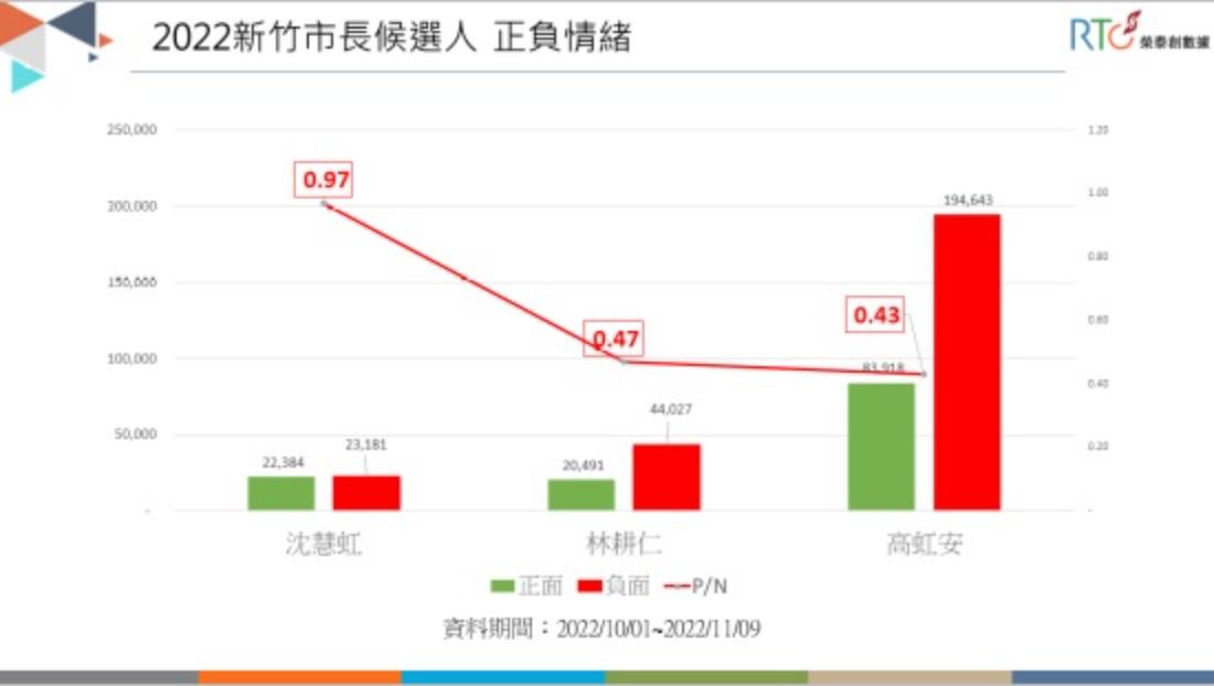 《榮泰創數據》從網路聲量數據,分析10月以來,高虹安聲量聲勢最高,但好感度卻是三人中最低的0.43;而林耕仁在大力拉抬下,好感度卻也僅0.47略為領先高虹安,在這一波藍白的攻防,反而是以沈慧虹的好感度最高達0.97。