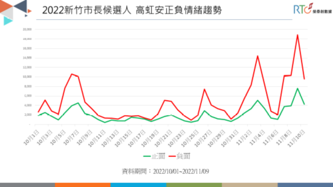 進一步觀察正負聲量的趨勢,高虹安在10月31日之後,負面聲量一波比一波高,顯示這一次的爆料指控對高虹安確實是造成傷害。