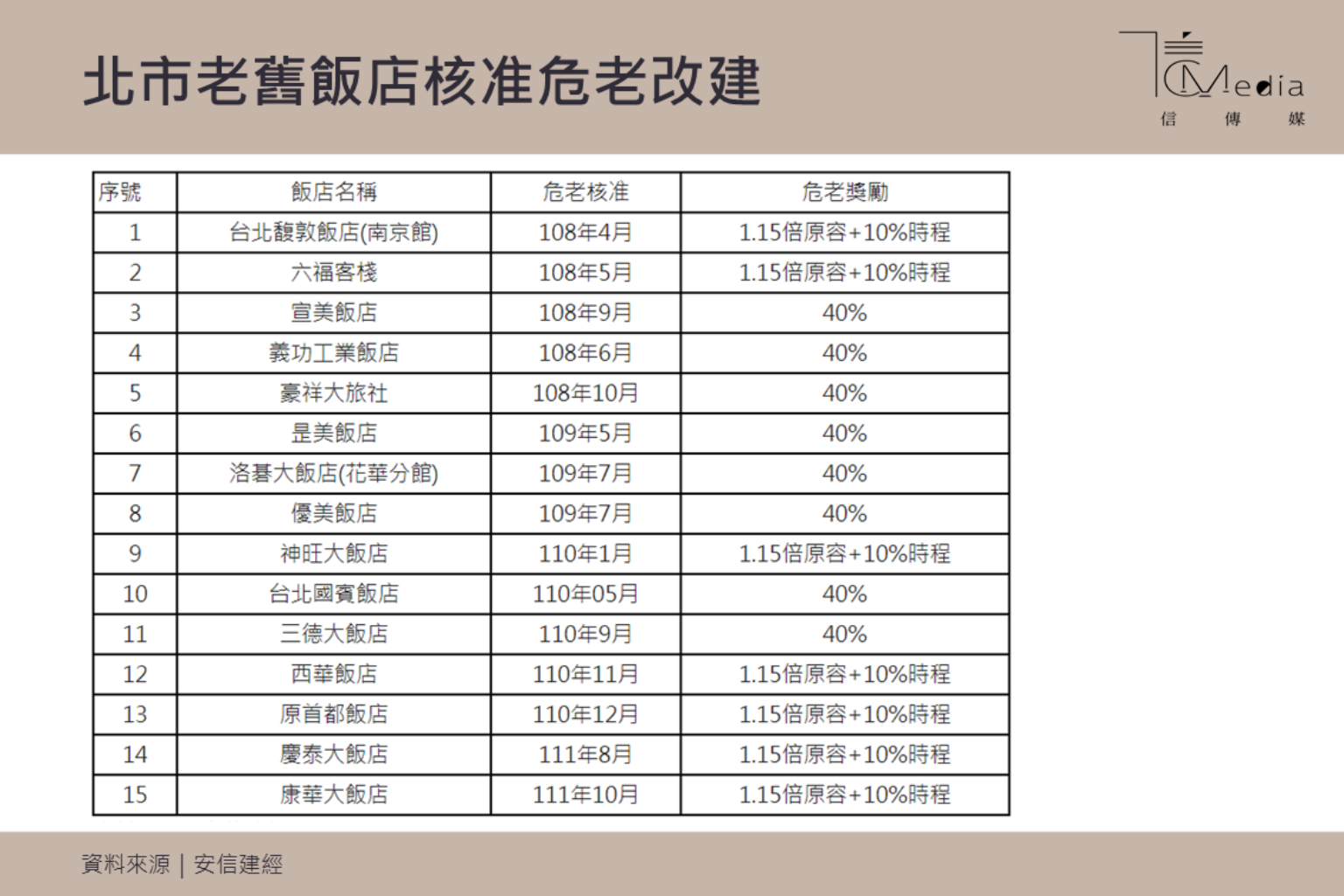 國賓飯店、六福客棧、康華大飯店等15家飯店都是危老