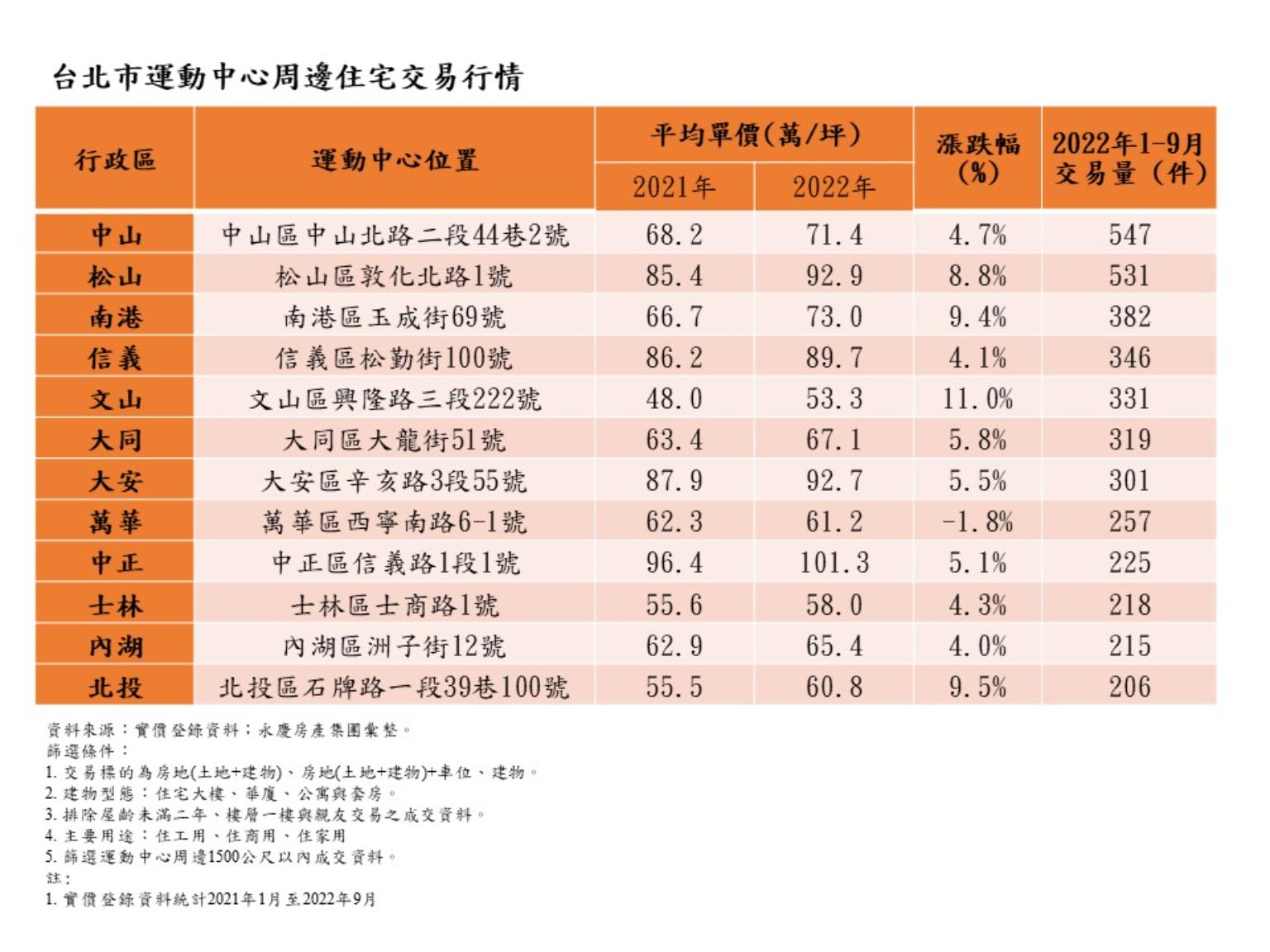 永慶房產集團依據實價登錄資料,統計雙北市各運動中心周遭房市交易數據。在台北市,交易量排名第一的是中山運動中心周邊,以547件獲得「最受歡迎運動宅」。