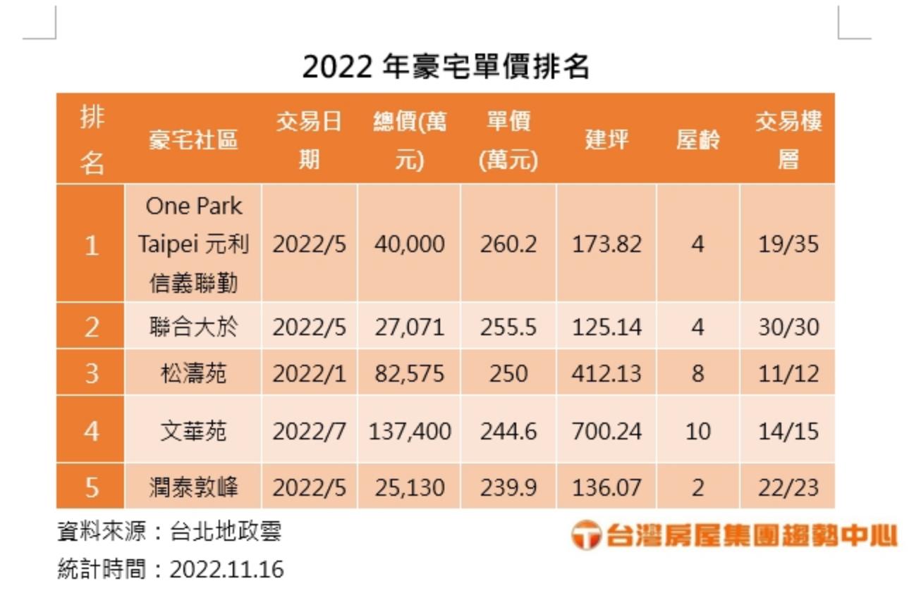攤開今年豪宅單價排名,以「One Park Taipei元利信義聯勤」在今年5月成交19樓戶,每坪單價來到260.2萬元最高,其次是「聯合大於」也同樣在今年5月成交30樓頂樓戶,每坪單價255.5萬元,搶進單價亞軍寶座;第3名則是今年初交易的「松濤苑」11樓戶,每坪單價也來到250萬元;而此次成交的「文華苑」頂樓戶則以單價244.6萬元擠進豪宅單價第4高。