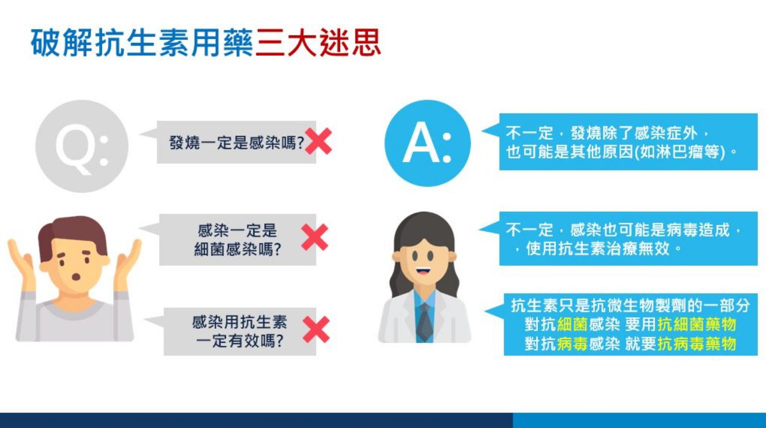 此外,陳宜君強調,透過感染管制以預防病菌散播、預防感染。「沒有感染,就不需要使用抗生素,就可以避免抗生素篩選的壓力。」她也提醒民眾應破除對抗生素使用的3大迷思,包括: