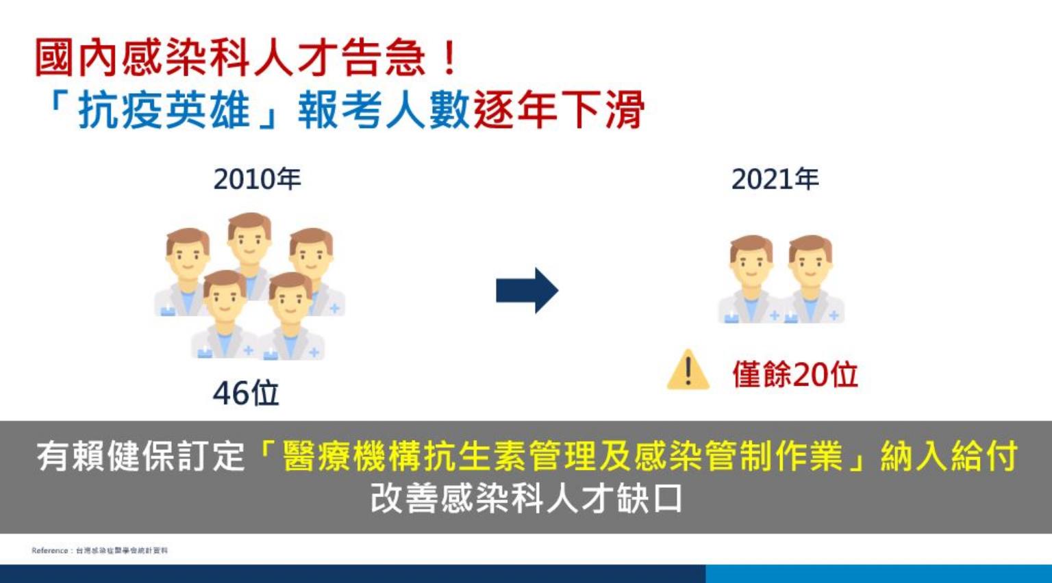 但國內超過半數區域醫院感染科醫師僅一位,面對抗生素管理、感染管制及防疫等多重需求下,感染管理續航量能將面臨重大挑戰;且感染症專科醫師報考人數逐年下滑,去年僅剩20位,出現嚴重人才荒。