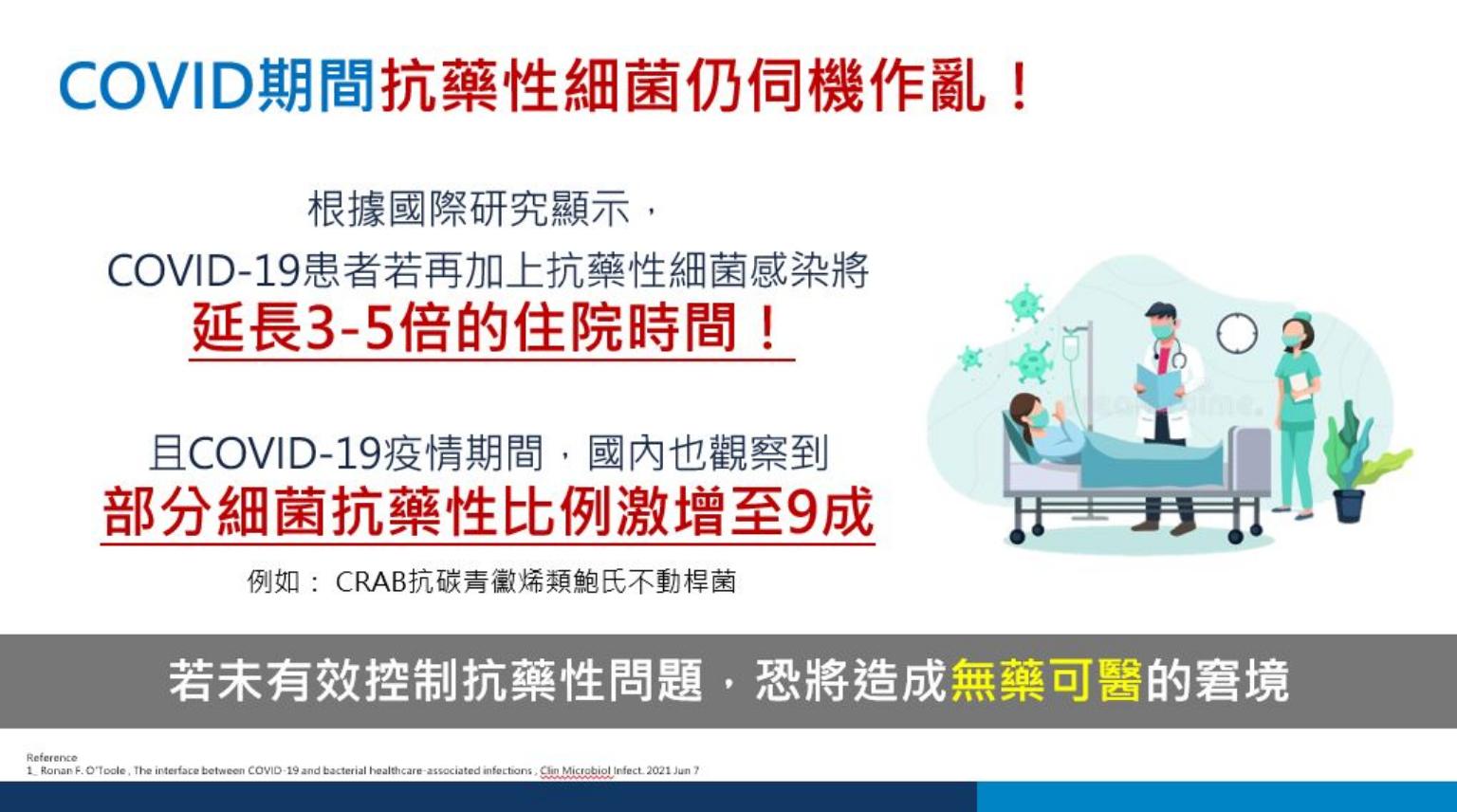 台灣胸腔暨重症加護醫學會理事長王鶴健也指出,「疫情後抗藥性細菌仍伺機作亂,照護新冠患者除了要應對病毒外,伴隨而來的細菌感染也會因抗藥性使治療更加棘手。」根據研究顯示,COVID-19患者若再合併抗藥性細菌感染,將延長3-5倍的住院時間。