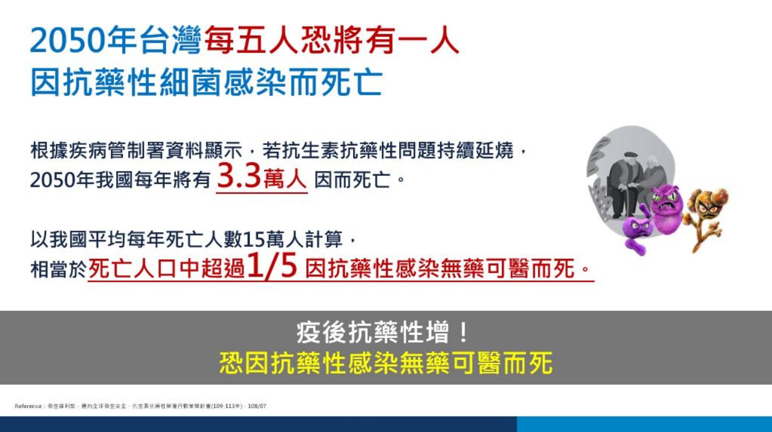 而疫情期間疾管署醫院感染管制與抗藥性監測系統(THAS),在今年第一季監測報告顯示,加護病房患者病原體檢驗報告中,部分細菌抗藥性比例激增至9成。王鶴健表示,「若抗生素抗藥性問題持續延燒,2050年台灣每5人恐將有1人因抗藥性細菌感染而死亡。」他也認為,透過跨科別團隊有效的執行抗生素合理使用,可降低抗藥性細菌比例。