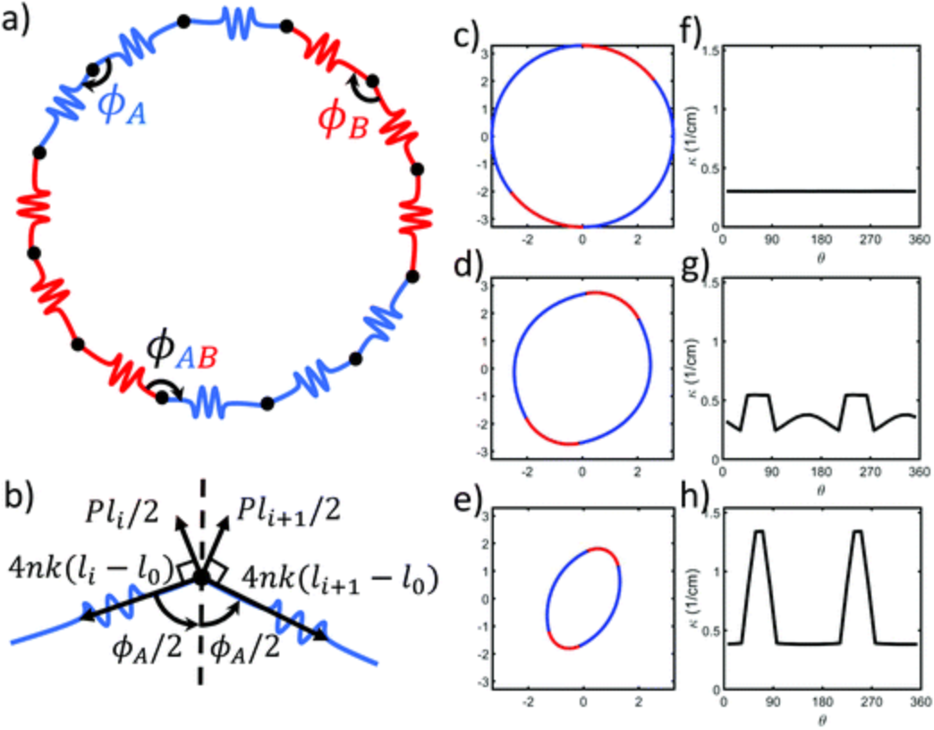 我們可以把袋熊腸道的截面模型,當作兩種不同的彈簧組合在一起,紅色的部分是容易被拉開的彈簧,藍色的部分是不容易被拉開的彈簧。為了維持力平衡,各處彈簧連接處的受力必須相等,拉開角度與伸長量的分析方法如 (b) 所示。