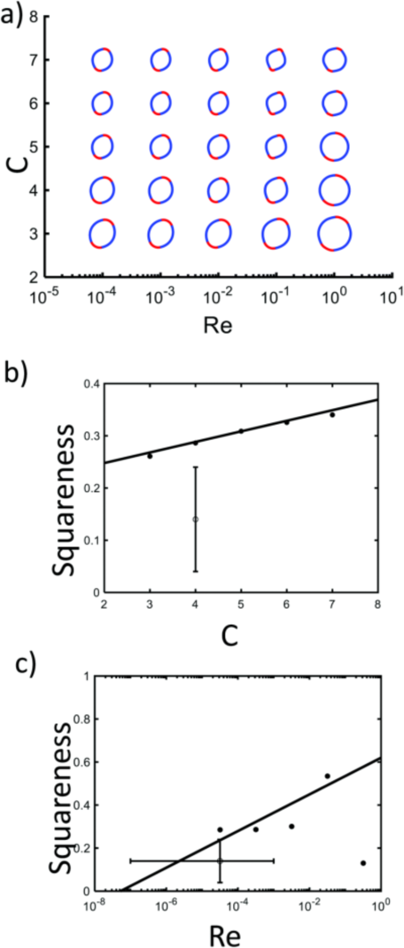 腸道蠕動的過程則可以簡單理解為有外力壓縮腸道,由於兩種彈簧受外力後的伸長量不同,因此腸道無法繼續維持圓形,最終形成類似橢圓形的形狀(如圖中 (c)、(d)、(e) 所示)。不過,這個模型是沒有便便在腸道中的模型,也沒有考慮腸道中兩種不同彈簧的受力伸長量(原文為 Stiffness,剛度)的差異,把這兩個變數考慮進去後,形狀就會接近正方形了!