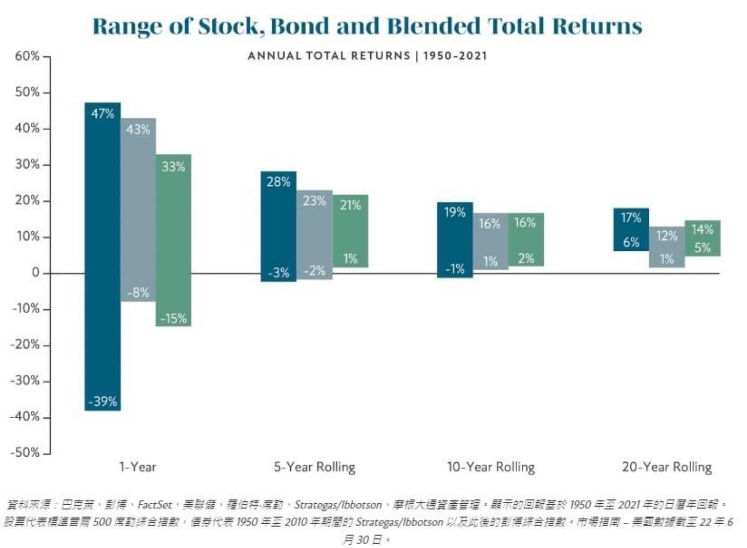 雖然上述因素都會讓價格與價值短期不一致,但長期投資組合的波動性會隨時間減少(價格與價值趨於一致),下圖為美國S&P500股票、債券的平均每年報酬率,持有一年的股票報酬受到短期市場恐懼或是樂觀的影響報酬可能有+47%與-39%的差距,但隨著持有時間越長,虧損的情況就越來越低,5年年平均報酬最差-3%,10年年平均報酬最差-1%,持有20年年平均報酬最低為6%,長期保持投資是降低投資組合波動的最佳方式,這也符合我們之前提到的「時間勝過時機」的結論。