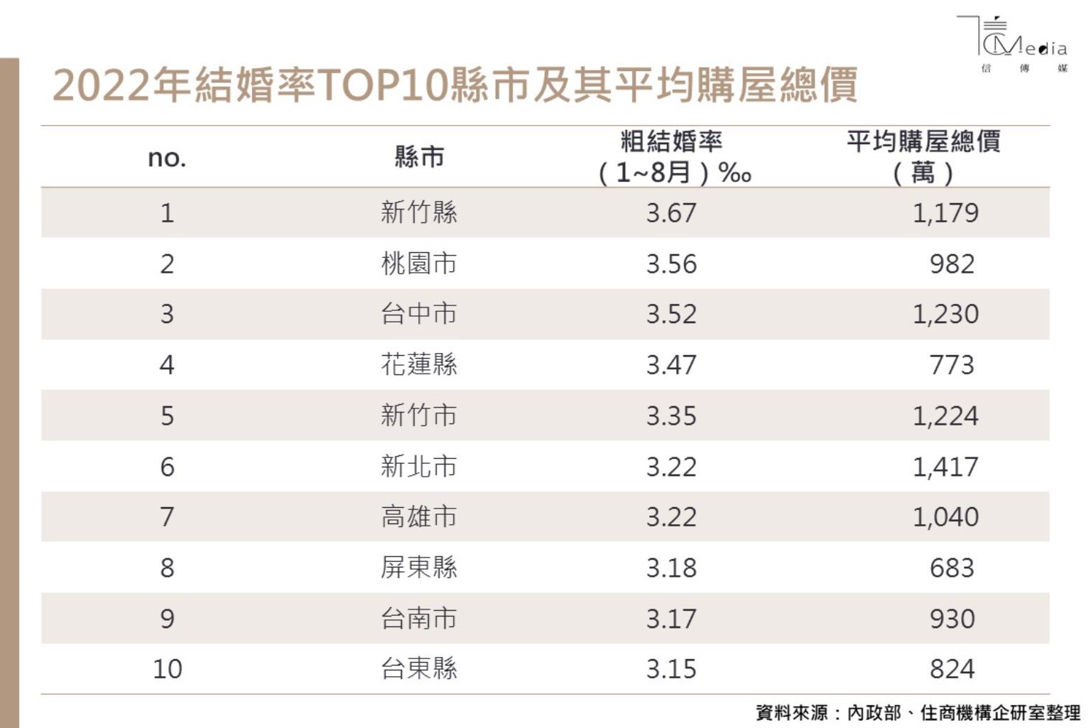 粗結婚率指特定期間內平均每千人的結婚對數,如新竹縣粗結婚率3.67‰,代表平均每1千人中有3.67對結婚,近幾年因科技園區成為房市大熱門的新竹縣市雙雙入榜結婚率前十名,其平均購屋總價在榜內屬高價位,新竹縣平均購屋總價1,179萬元、新竹市平均購屋總價1,224萬元,僅低於新北市及台中市。郎美囡表示,新竹縣市因科技業蓬勃發展,平均薪資高、消費力強,雖然房價在前兩年順著房地產多頭之勢大幅成長,不過科技業未來發展可期及在地剛需支撐,成家比例較高。