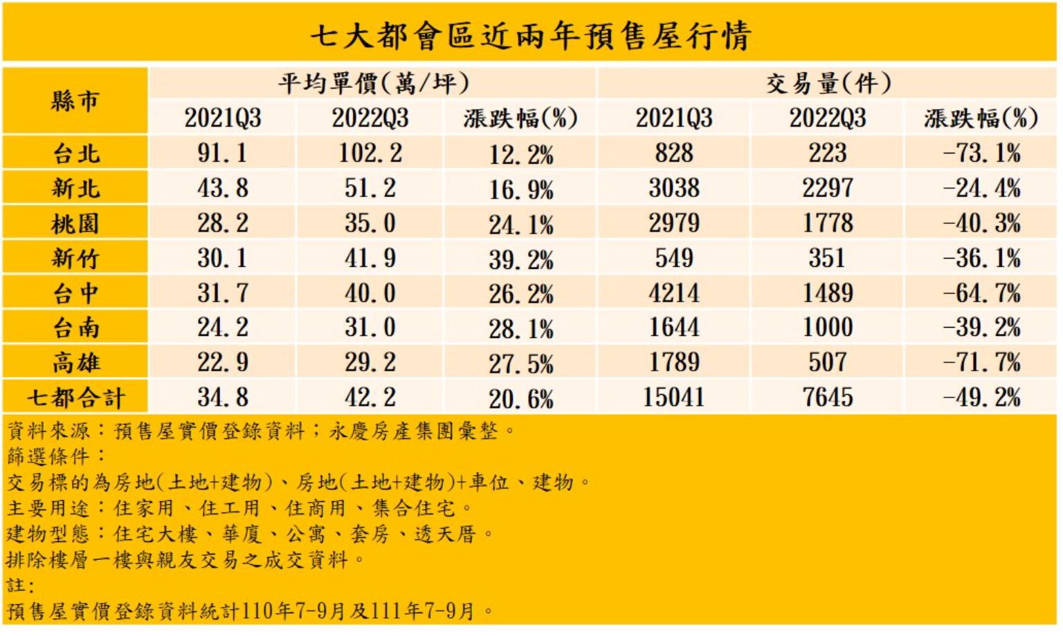 然而從2022年開始,美國聯準會(FED)連續升息15碼、烏俄戰爭開打、兩岸關係等變因,為房市帶來不確定性。永慶房屋研展中心副理陳金萍說明,觀察近兩年第三季的預售屋價量表現,今年第三季七大都會區預售屋平均單價較去年同期上漲逾二成;然而升息及地緣政治風險影響下,建商和消費者的購屋情緒都受衝擊,市場轉趨保守,預售屋成交量較去年同期下滑49.2%。