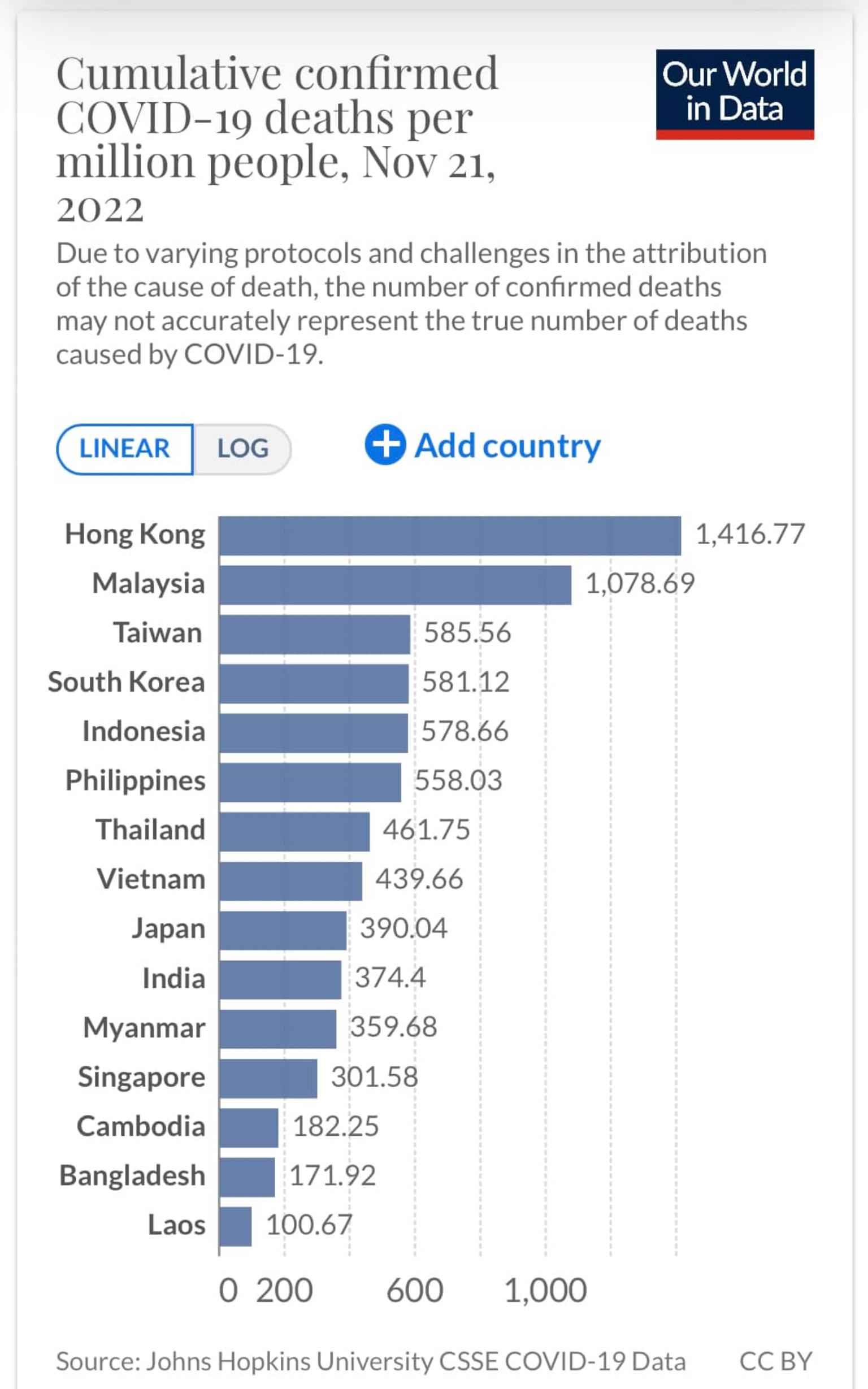 台灣的新冠累積百萬人死亡數低於香港、馬來西亞,稍高於韓國,但是高於印尼、菲律賓、泰國、越南、日本、印度、緬甸、新加波、柬埔寨、孟加拉、寮國等東北亞、東南亞和南亞諸國。