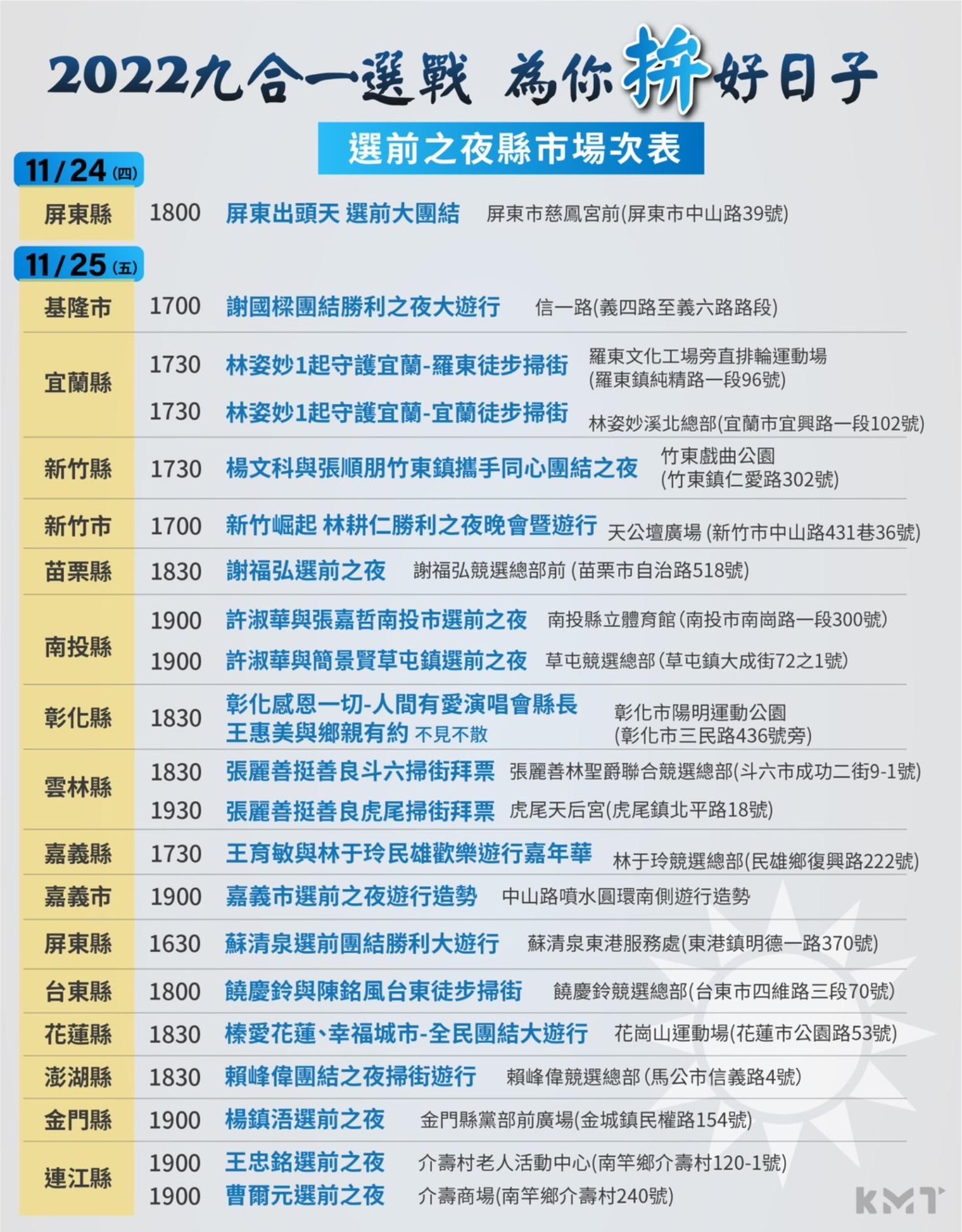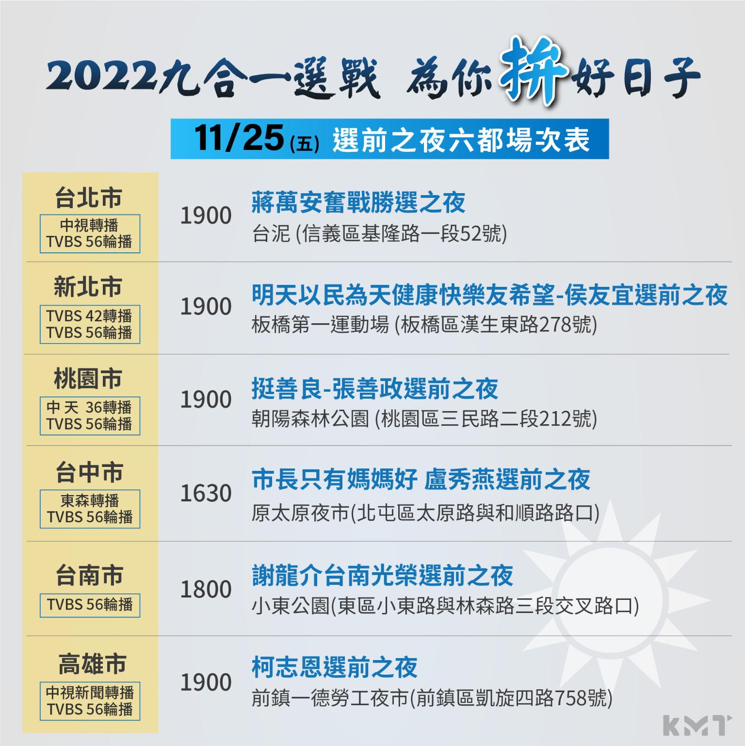 九合一選舉即將於週六(26)投票,國民黨文傳會主委洪孟楷、副發言人楊智伃今天上午召開記者會,公布國民黨在全台各縣市「選前之夜」活動時間地點。洪孟楷指出,今年參照2018年做法,希望延續2018年氣勢,一舉贏得最多選民的認同跟支持;先前幾次的大型造勢,國民黨提名的縣市長候選人都已經多次合體,展現團結一心、合體向前的氣勢,