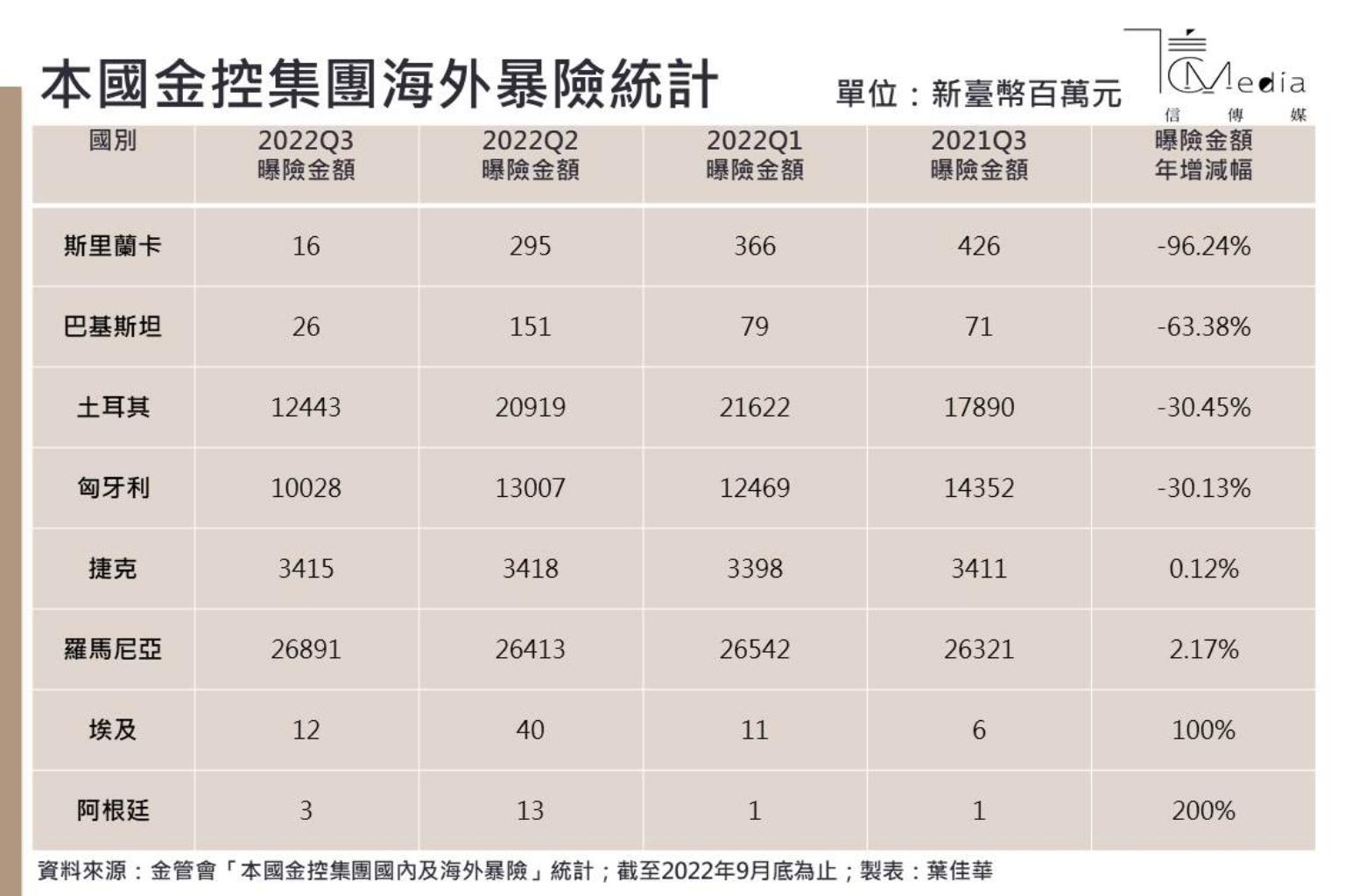根據金管會最新揭露16家金控集團國內及國外曝險情況,截至今年第3季底,金控集團對羅馬尼亞投資292.77億元,扣除投資評價減損23.85億元,合計曝險數字為268.91億元;除此之外,對土耳其曝險也有124.43億元、對匈牙利則曝險100.28億元,其餘5國的曝險金額則落在3百萬~34億元不等。