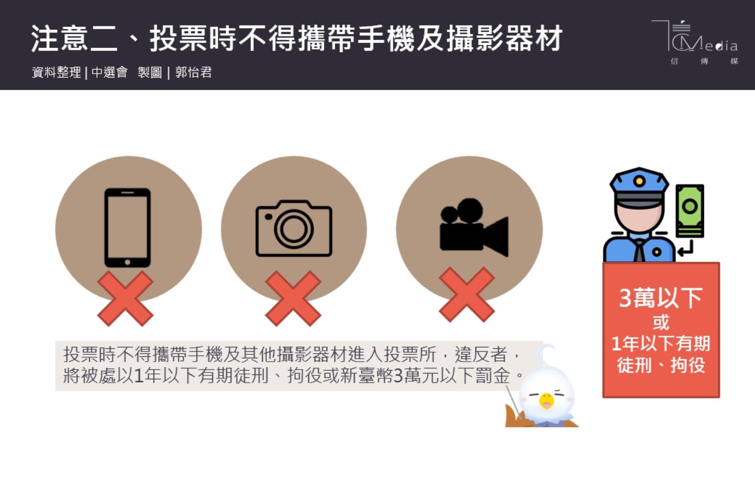 投票時不得攜帶手機及其他攝影器材進入投票所,違反者,將被處以1年以下有期徒刑、拘役或新臺幣3萬元以下罰金。