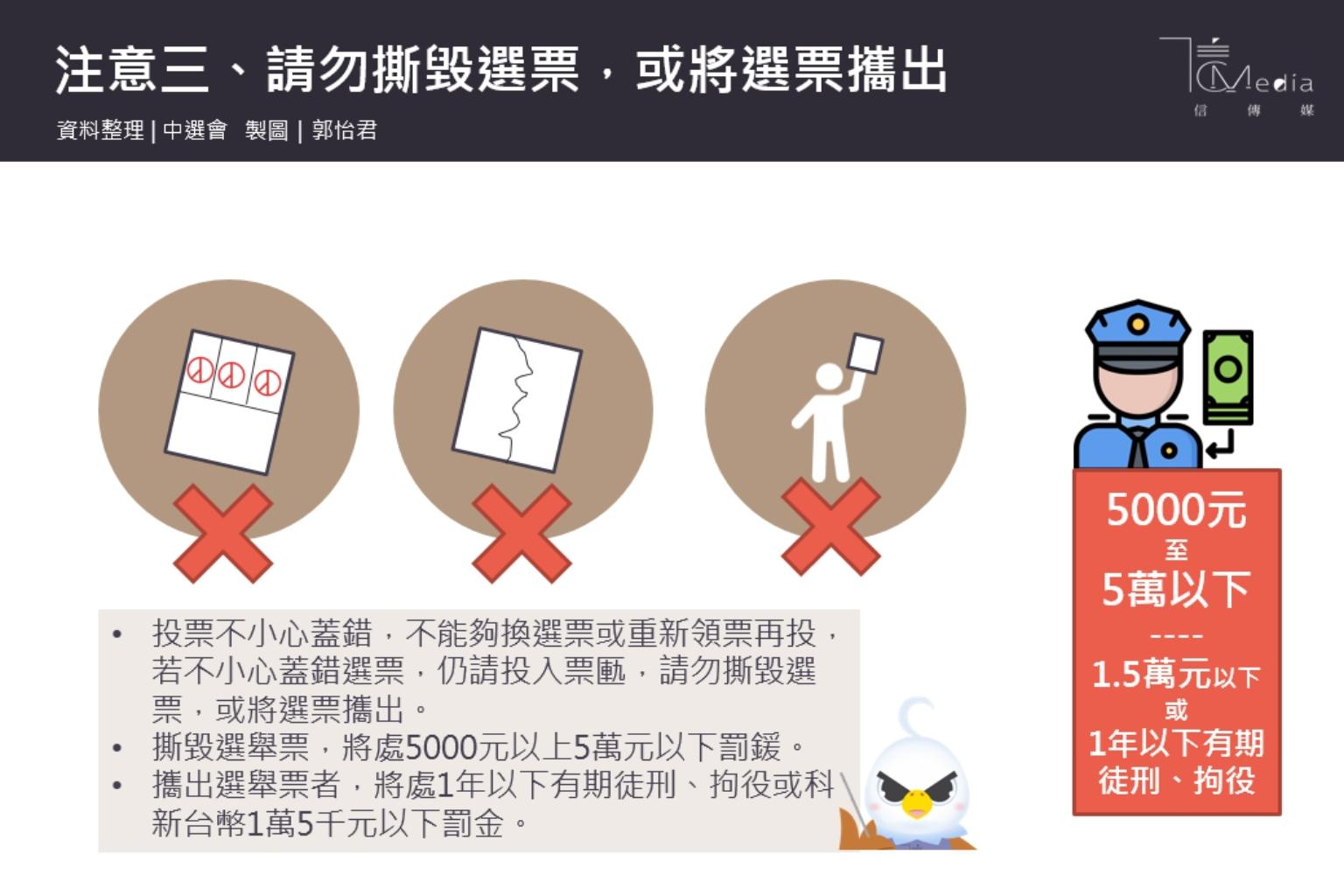 民眾如果遇到投票不小心蓋錯,是不能夠換選票或重新領票再投,若不小心蓋錯選票,仍請投入票匭,請勿撕毀選票,或將選票攜出。撕毀選舉票,將處5000元以上5萬元以下罰鍰;攜出選舉票者,將處1年以下有期徒刑、拘役或科新台幣1萬5千元以下罰金。