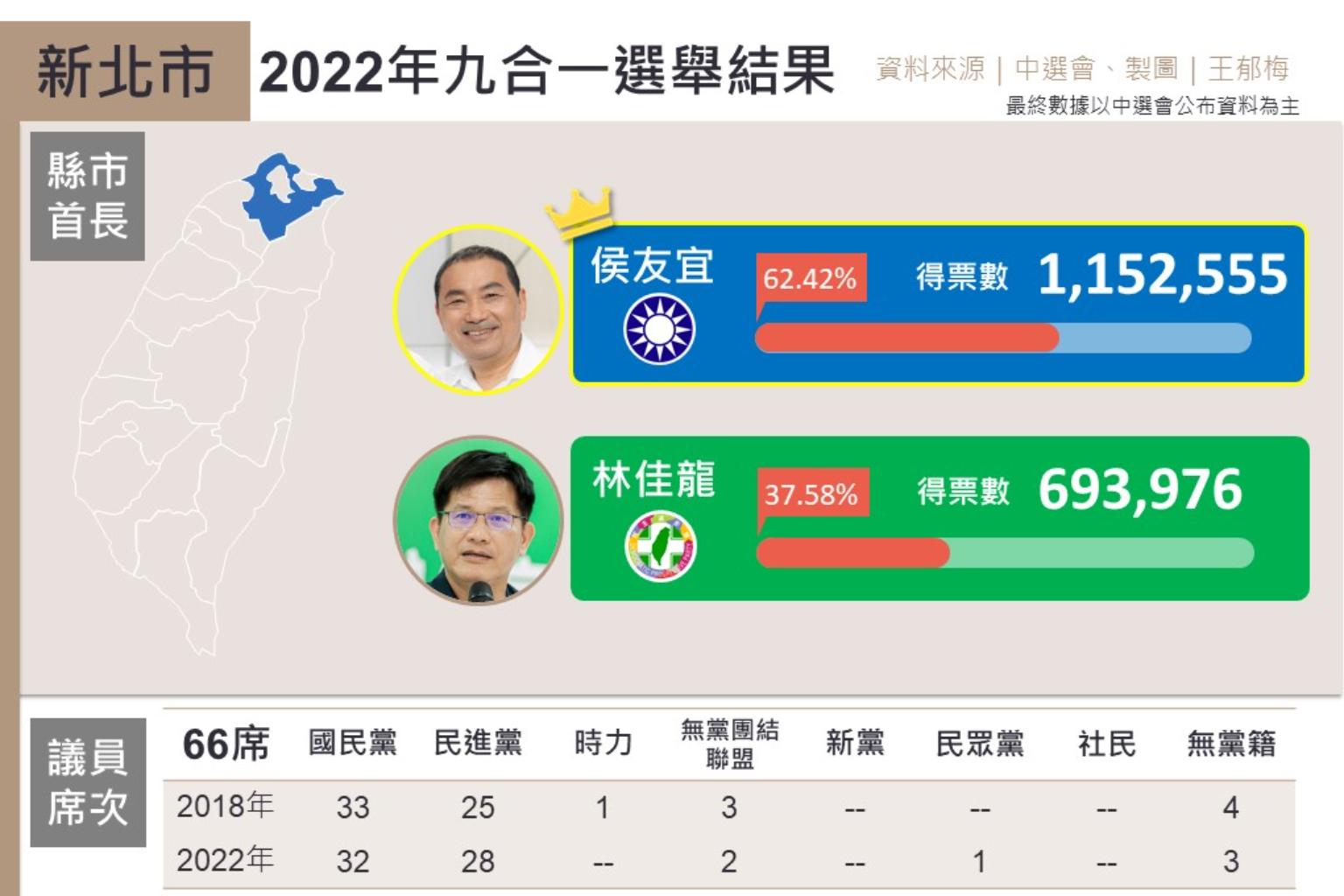 值得注意的是,新北市長侯友宜於晚間8時20分自行宣布勝選,他不只得票超過百萬票,還大贏對手林佳龍超過40萬票,比4年前贏對手蘇貞昌的29萬票還更「超越」。黨內要角直言,這種「史詩級」的領先票數,奠定了侯友宜「藍營共主」地位,藍營各山頭將群起簇擁侯友宜直取2024大位。