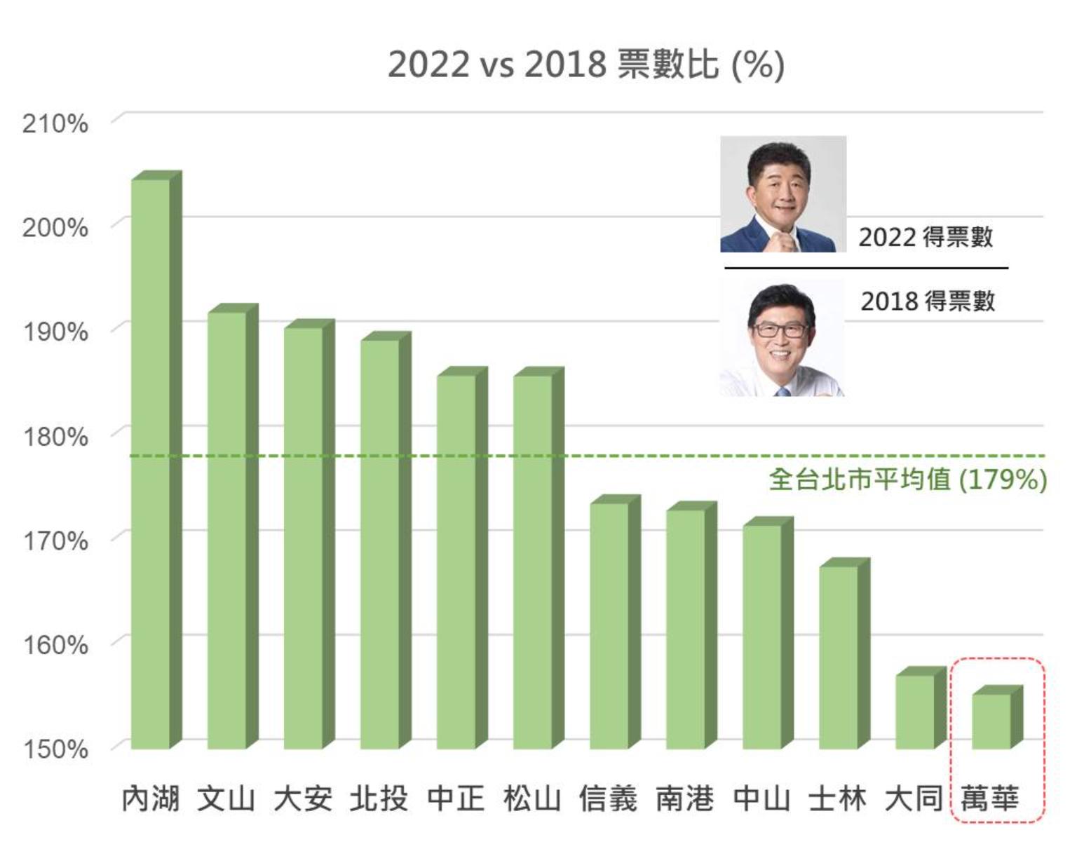 很明顯的,萬華區是本次民進黨候選人得票數增長比最低的區域。