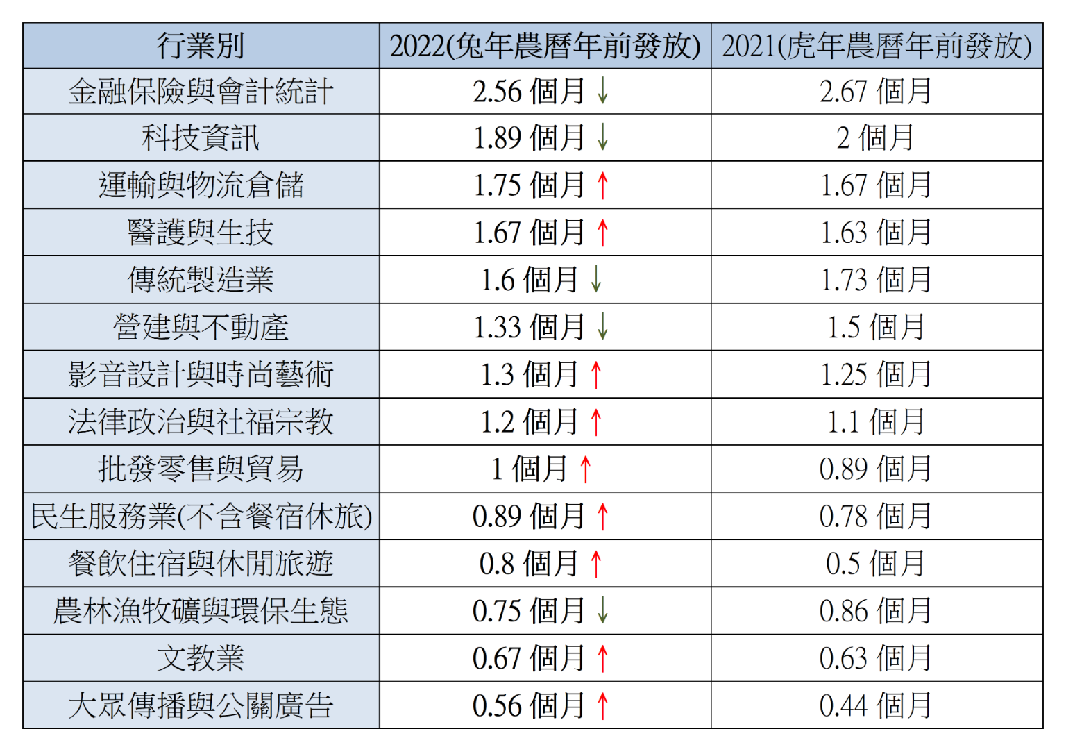 反之,年終獎金「比較低」的則有:「大眾傳播與公關廣告業」(0.56個月)、「文教業」(0.67個月)、「農林漁牧礦與環保生態業」(0.75個月),以及「餐飲住宿與休閒旅遊業」(0.8個月)、「民生服務業(不含餐宿休旅)」(0.89個月)。