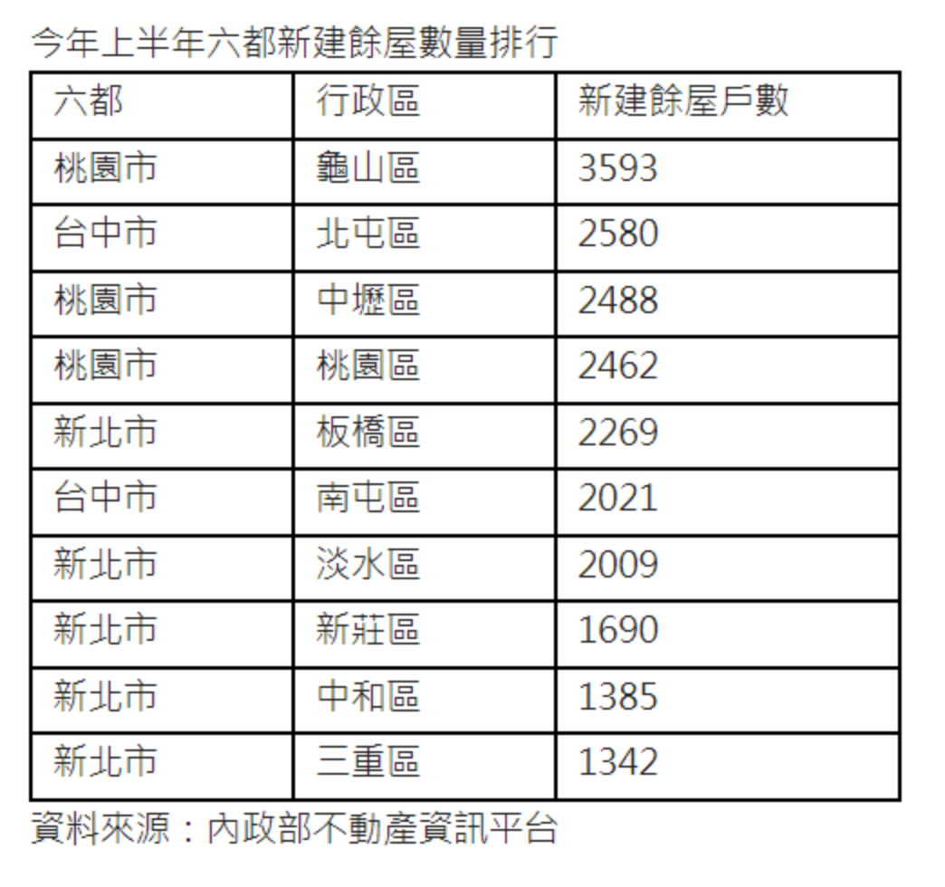 根據台電低度用電資料顯示,六都各行政區新建餘屋(待售)住宅宅數排行,第一名是桃園市龜山區的3593戶,過去長年空置率偏高的淡水區,新建餘屋僅排行第七名,第二名則是台中北屯區,第三名為桃園中壢區,第四則為桃園區,景氣若暢旺時新建餘屋並不會對市場產生影響,不過一旦景氣反轉後,區域的新建餘屋可能會對房市產生壓抑。