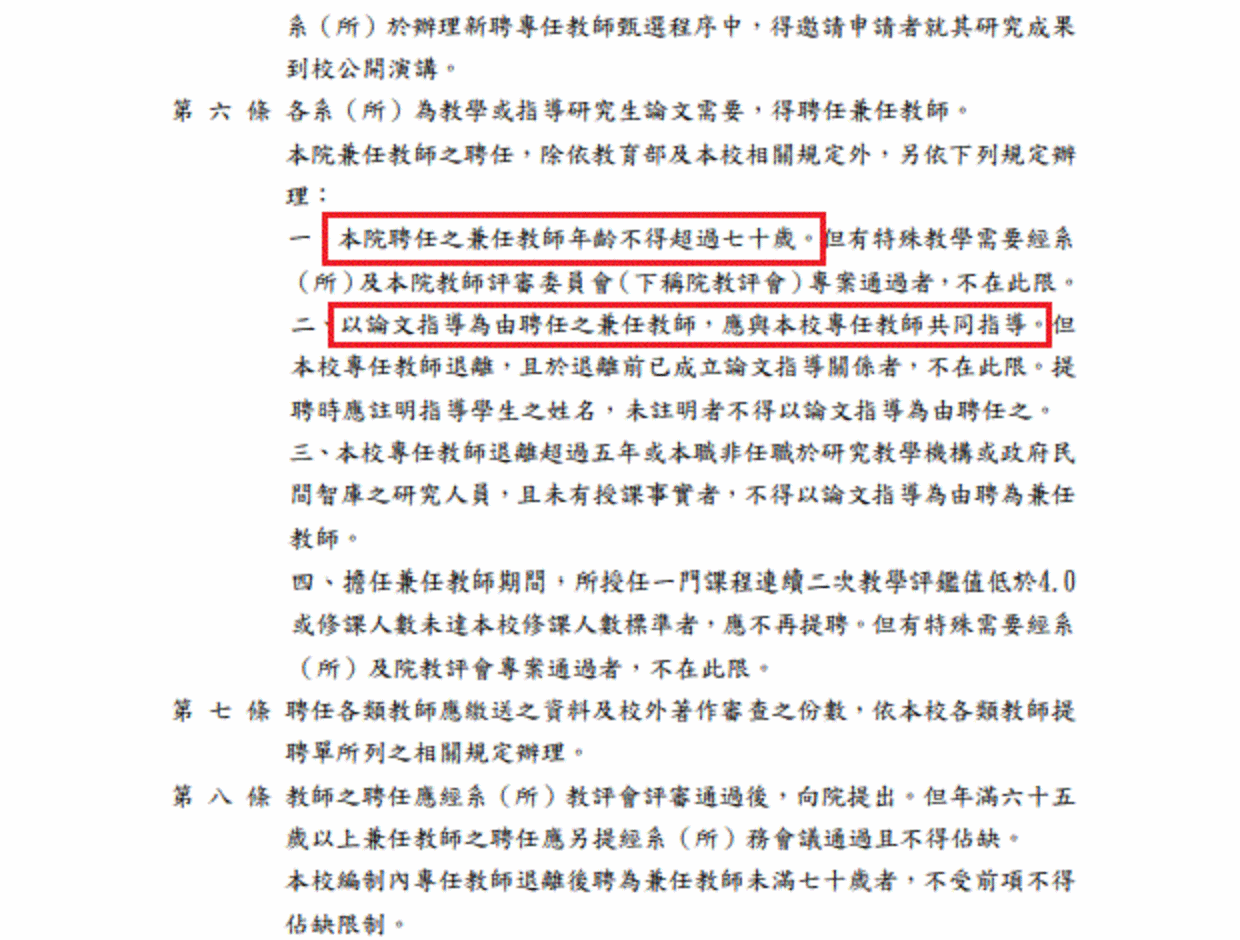 其次,該校再於10月27日修訂「社會科學院教師聘任審查細則」,規定除特殊教學需求,兼任教師年齡不得逾70歲。