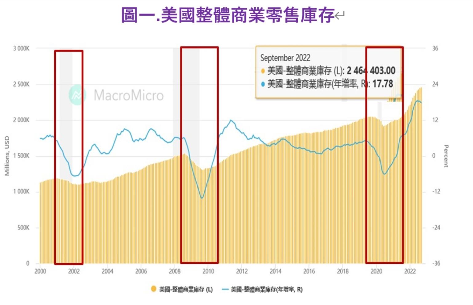 目前消費需求大幅萎縮及庫存破表的調整壓力將會是廠商最大噩夢,從貨櫃航運運價大跌,9月份美國整體零售庫存持續破表且大創新高,見下圖一美國整體商業零售庫存所示,說實在的就是之前重複訂貨及塞貨造成終端通路廠商庫存非常嚴重。從以往庫存最高峰往下調整到庫存低點都要一年以上的經驗來看,見下圖二紅色框線所示,預期本次庫存破表的調整時間至少需要一年以上,很多公司不僅要清庫存也將面臨一段時間沒有訂單,另外也需提防廠商倒閉的呆帳出現!