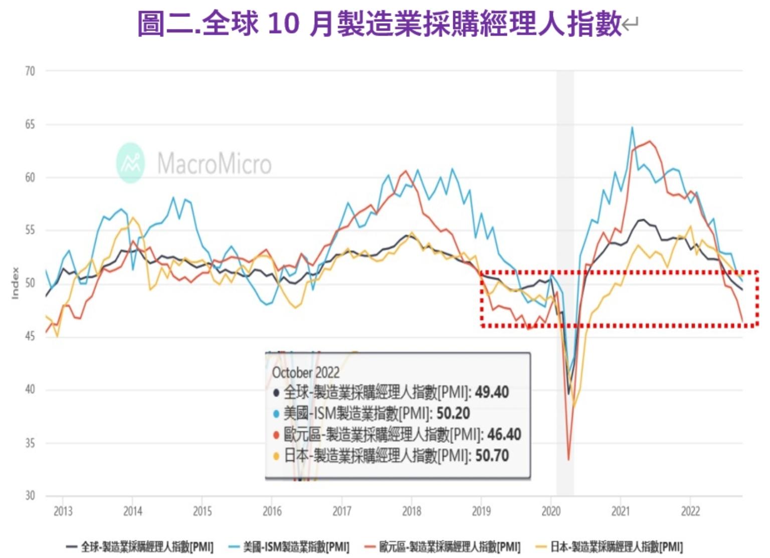 在景氣及消費需求不佳及企業獲利下滑、存貨調整未結束完畢前,未來企業獲利還有大幅下修風險;再從10月份全球製造業採購經理人指數PMI都已經比疫情前還要差,見下圖二所示,但目前美股四大指數、台股大盤及個股股價卻比疫情前高很多,需提防未來股市及個股股價反彈完畢還會有大幅下跌空間,投資人不要因為反彈一兩個月就忘記今年初大跌的情況。
