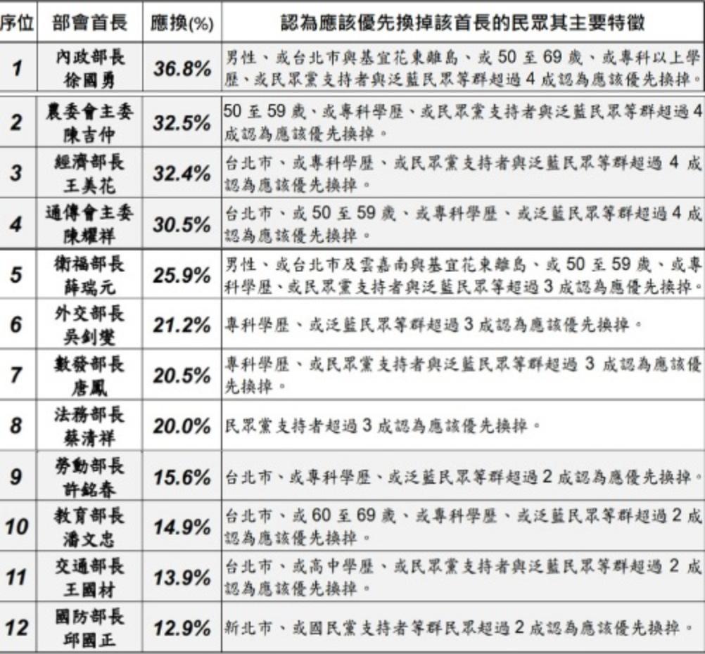 第一位是提出請辭的內政部長徐國勇為36.8%;「班班吃石斑」跳票的農委會主委陳吉仲以32.5%居次;經濟部長王美花為32.4%;推動《中介法》惹出軒然大波的國家通訊傳播委員會(NCC)主委陳耀祥為30.5%。