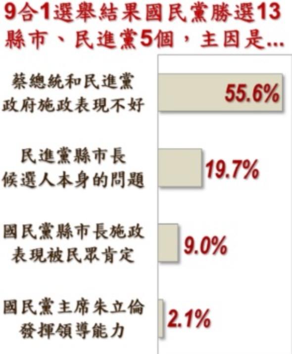 民調指出,歸納民眾認為藍勝綠敗,有關民進黨的因素占75.3%、國民黨因素占11.1%,其中5成6認為蔡總統和民進黨政府施政表現不好以致,顯然「民眾的看法與蔡總統對敗選歸因迥然不同。」