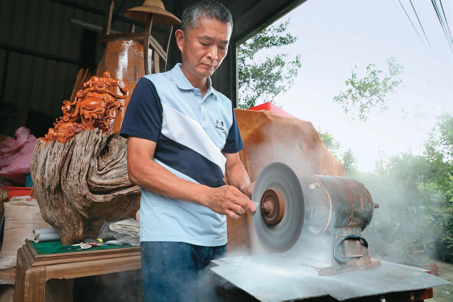 鄧福志攤開雙手比劃著,憶及當年初學螺鈿,為了將貝殼打磨出基本的水滴形狀,常常一個不注意就傷到手指;也曾因為要將貝殼磨平,但失手打滑,就被機器削去一層皮,有時好幾個月的時間,他都是在受傷、包紮、再繼續練習的過程中度過。