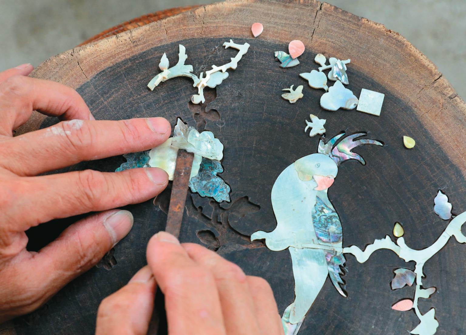 鄧福志再仔細解釋,螺鈿裝飾常見的主題是花鳥瑞獸,大多是具有吉祥意味的牡丹花、荷花或是祥龍、蝙蝠等,也因此,每個細緻的圖層都考驗著手藝,步驟也相當繁瑣講究。從繪製樣稿就開始琢磨、尋覓適合配色的貝色珠光,再將圖樣剪下黏貼於貝殼上,依著線條切割成片、磨平貝片貼上木面;小心翼翼描出嵌入範圍、沿線刨出凹槽、鑲入貝片,還得再次磨平,最後割上線條等,才算是大功告成。