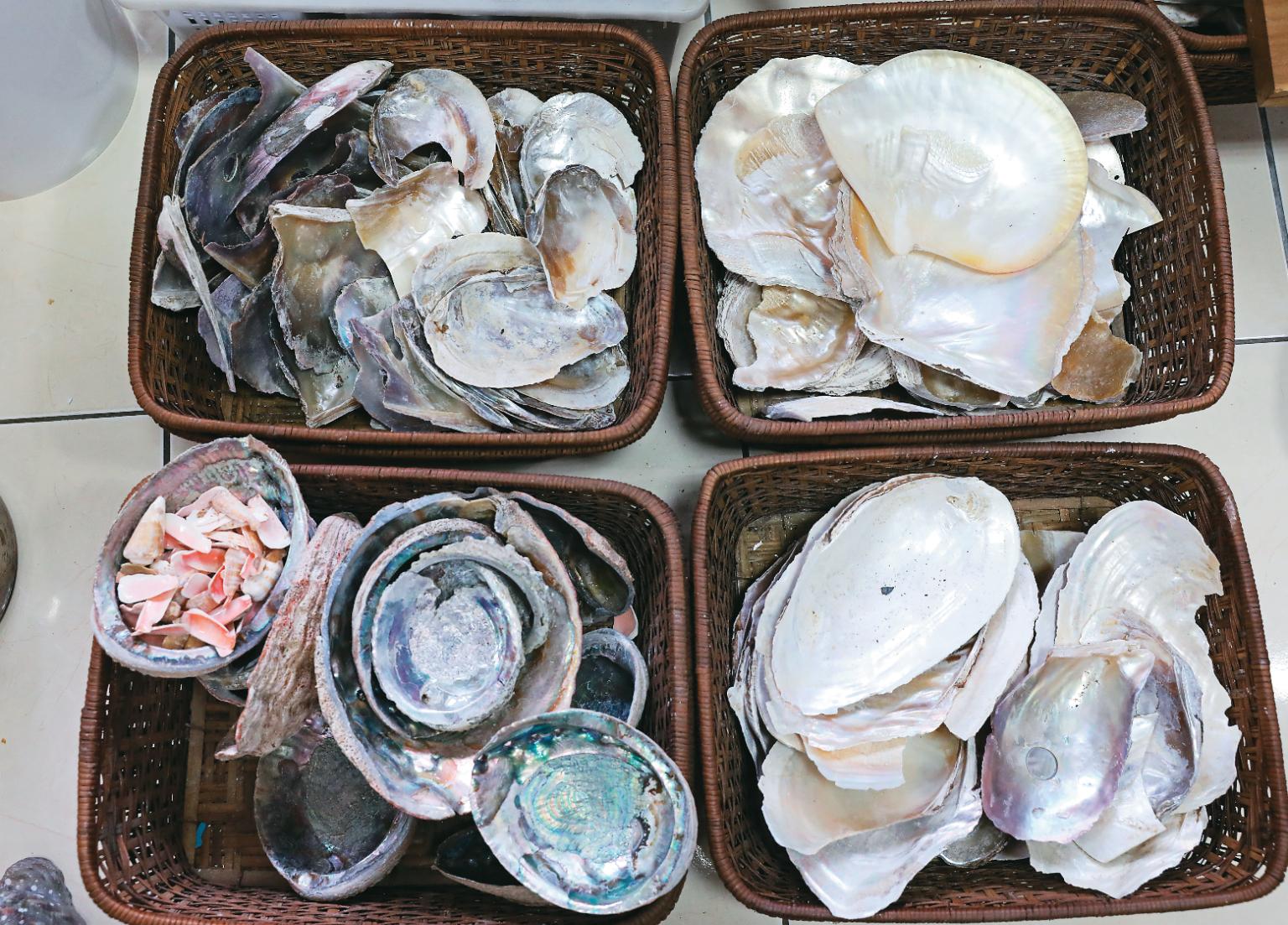 他拿起貝殼逐一展示,「除了技術的學習,分辨貝殼也是學習螺鈿重要的工夫。」舉凡珍珠貝、九孔貝、養珠貝、夜光貝等都是螺鈿常用的貝類材料,其厚度、亮度與顏色都有所不同,得依著客人的預算需求以及圖樣配色來擇選。比如說,九孔貝的藍色部分,以及淡水養殖、亮度較低的粉貝,這兩者就常拿來製作成石頭或枝葉;紅色的螺貝則用於鳥嘴或是花瓣的配色上。