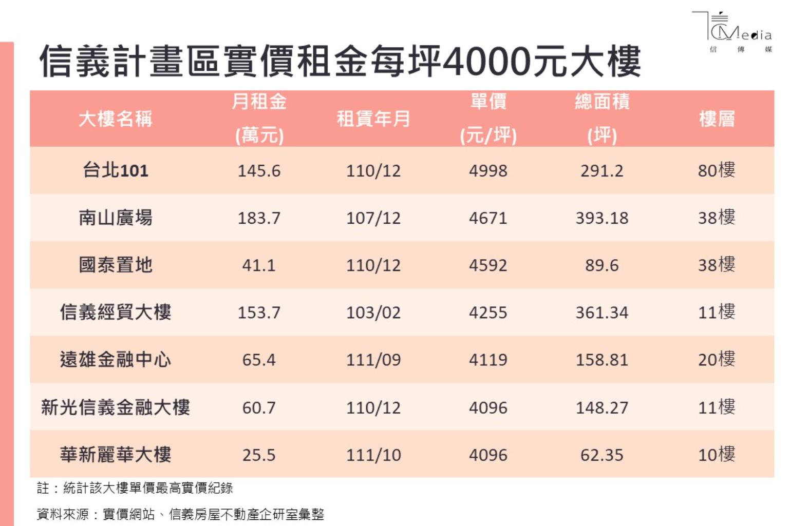 目前單坪4000元租金實價行情的辦公大樓,包括有台北101大樓、國泰置地廣場、南山廣場、信義經貿大樓、新光信義金融大樓、華新麗華大樓與最新揭露的遠雄金融中心大樓。