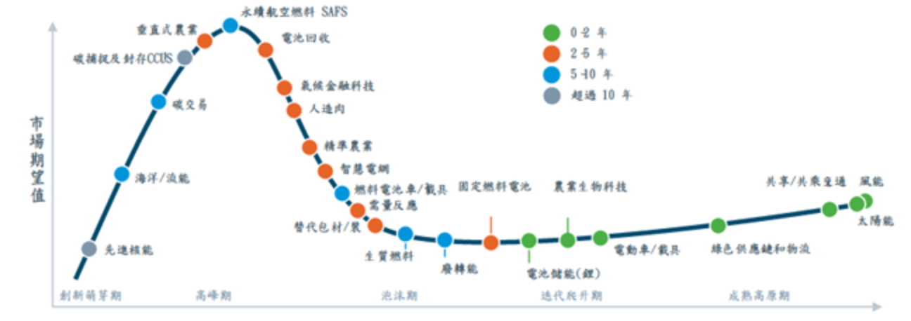曲線橫軸的左右兩端,分別代表綠色科技的萌芽到成熟的生命週期: