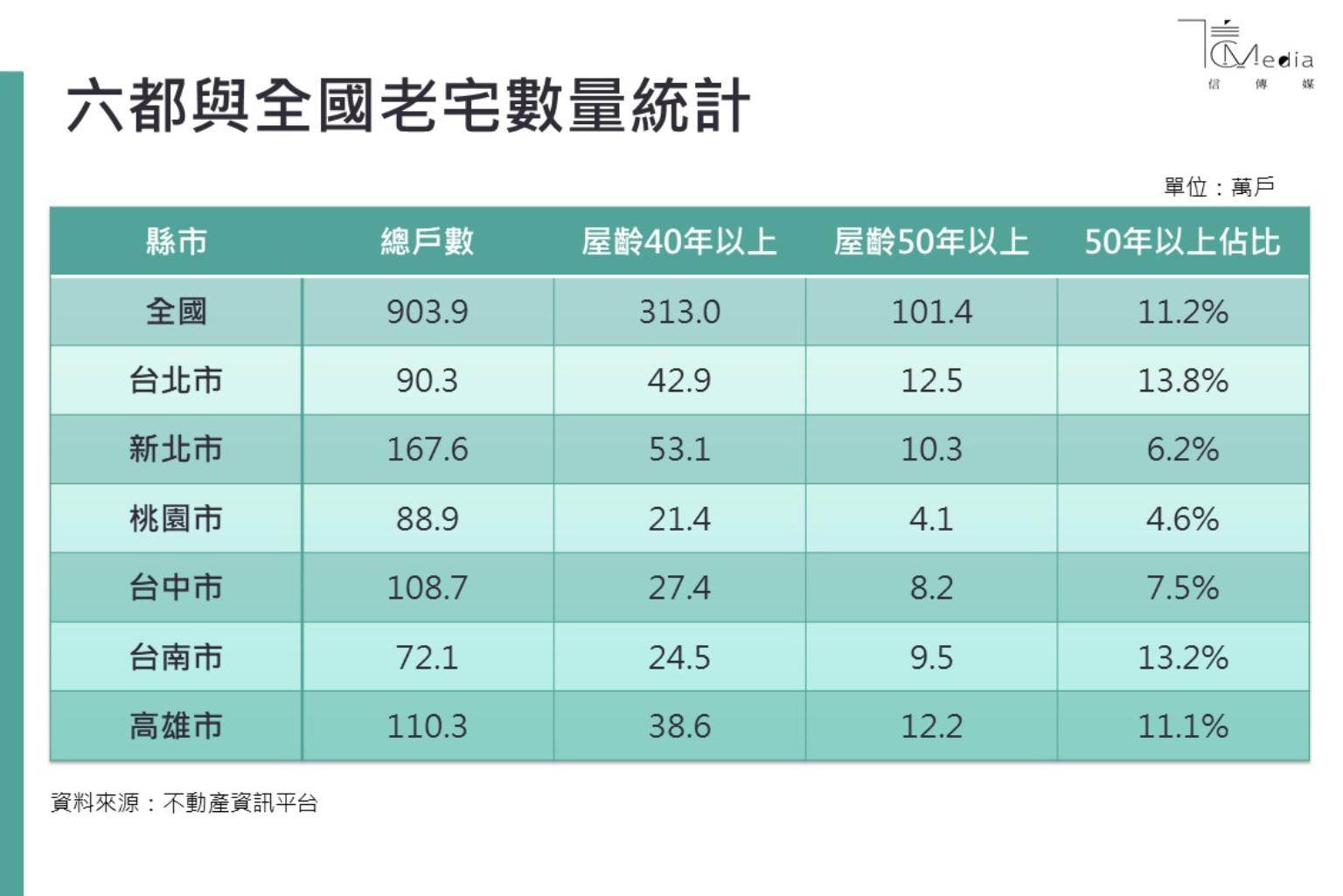 根據不動產資訊平台資料顯示,國內住宅老化速度快速,今年第三季屋齡50年以上老舊住宅首度超過百萬戶,其中數量最多的是台北市的12.5萬戶,高雄市的12.2萬戶,桃園市4萬戶則是六都中最少的。住宅老化速度快速,政府雖然積極推動危老政策,但更新速度遠不及整體住宅老化快速。